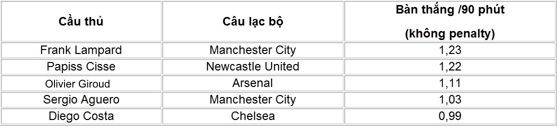 Nếu bỏ qua những bàn thắng được ghi từ chấm penalty, hiệu suất của Sergio Aguero càng sụt giảm khi chỉ đứng ở vị trí thứ tư. Năm chân sút hiệu quả nhất vẫn là những cái tên đã được liệt kê ở trên nhưng Aguero đổi vị trí cho Giroud khi hiệu suất của chân sút này là 1,03 bàn/trận.
