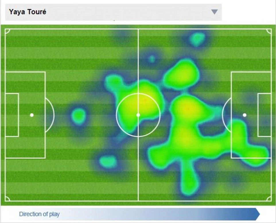 | Bản đồ nhiệt cho thấy tầm hoạt động không biết mệt mỏi của tiền vệ Yaya Toure. |