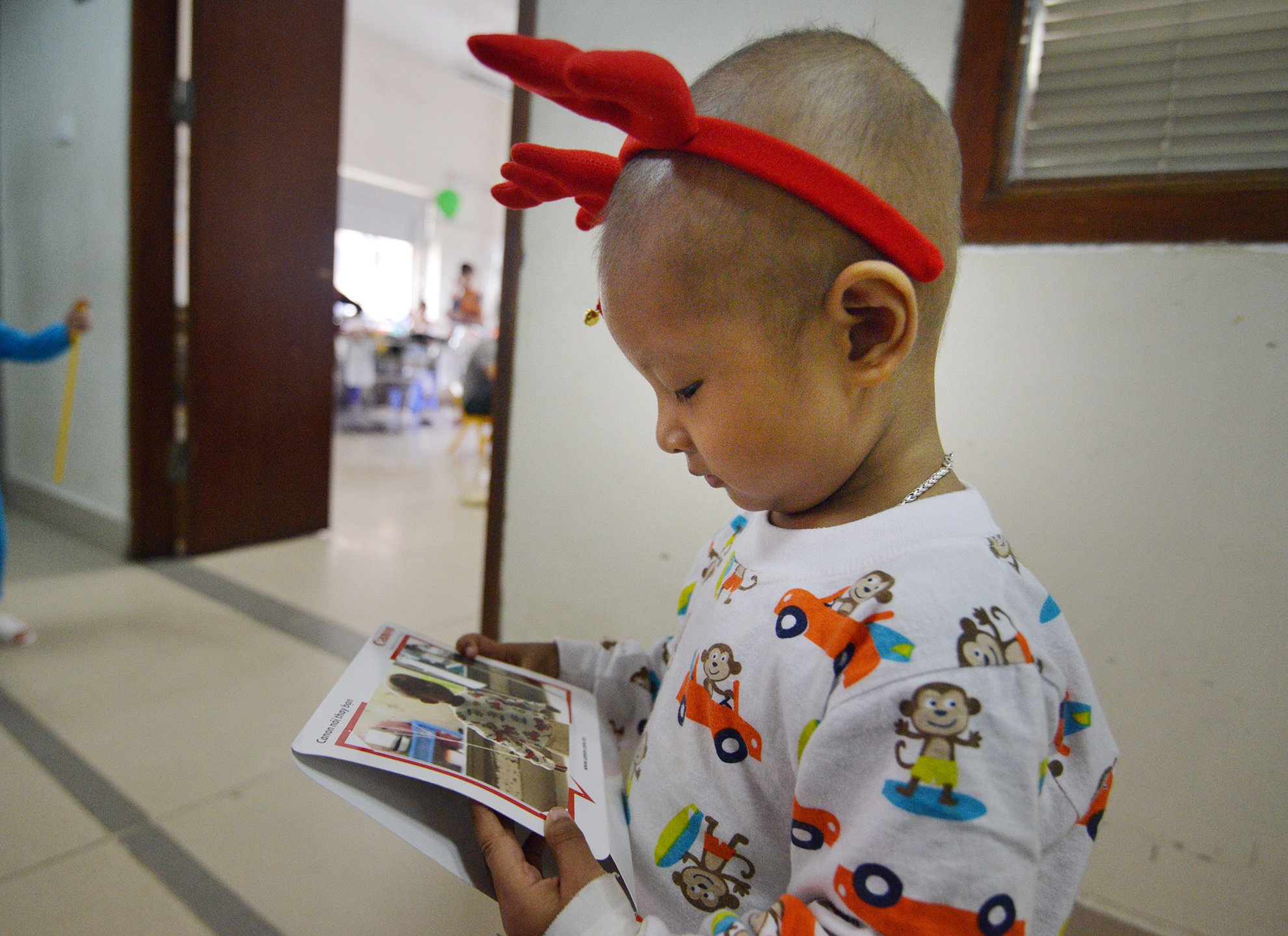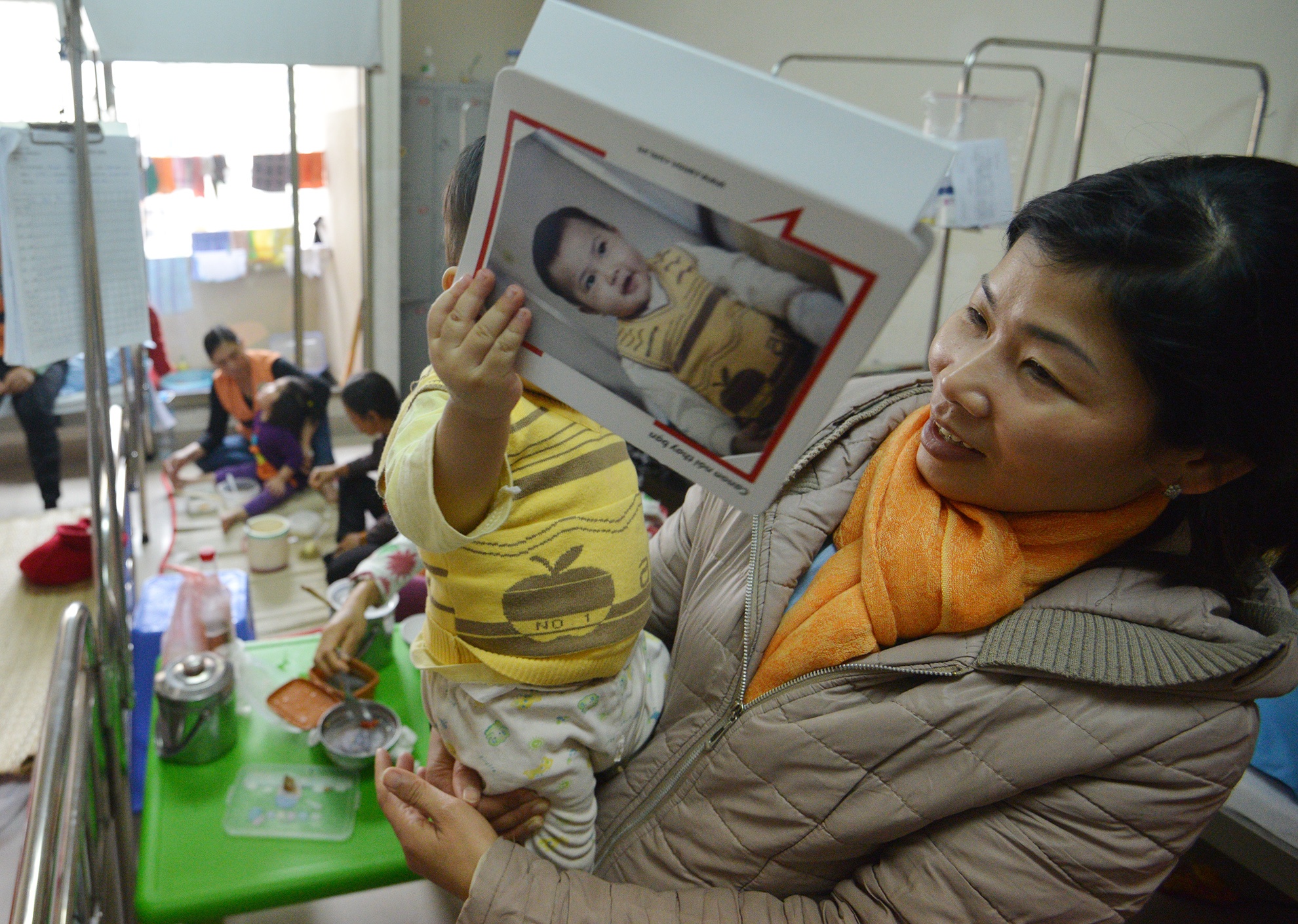 | Bé Hào Nam năm nay 1 tuổi (quê Thanh Hóa) bị sốt huyết tiểu cầu tỏ ra rất hiếu động. Bé đi đâu cũng cầm bức ảnh trên tay khoe với mọi người. |