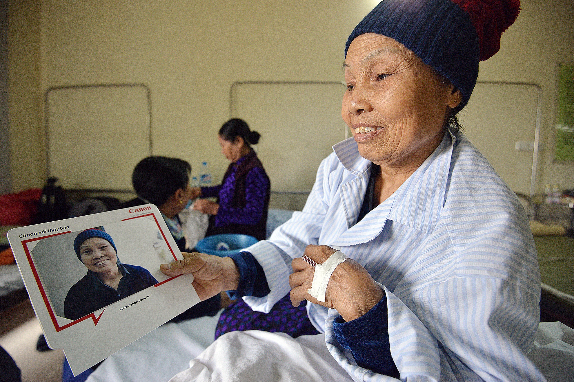 | Bà Lưu Thị Dung (69 tuổi) đến từ Nho Quan, Ninh Bình vui vẻ nhận bức ảnh từ ban tổ chức. Bà hiện bị bệnh Down tủy xương, đã vào viện chữa được 3 tháng. |