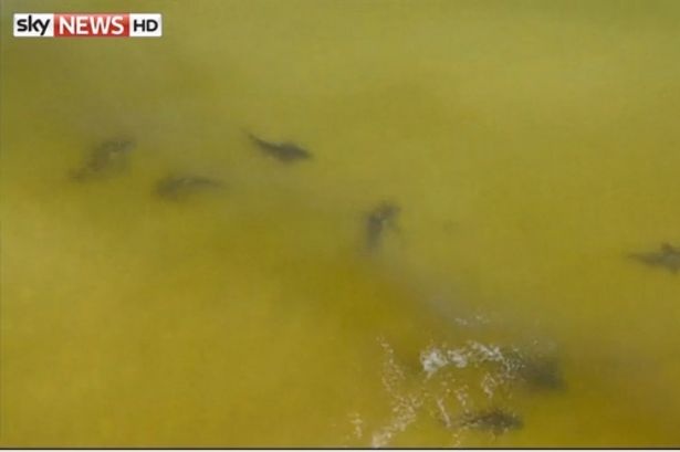 | Hơn 150 con cá mập xuất hiện tại bờ biển thuộc bang Alabama, Mỹ. Ảnh: Sky News |