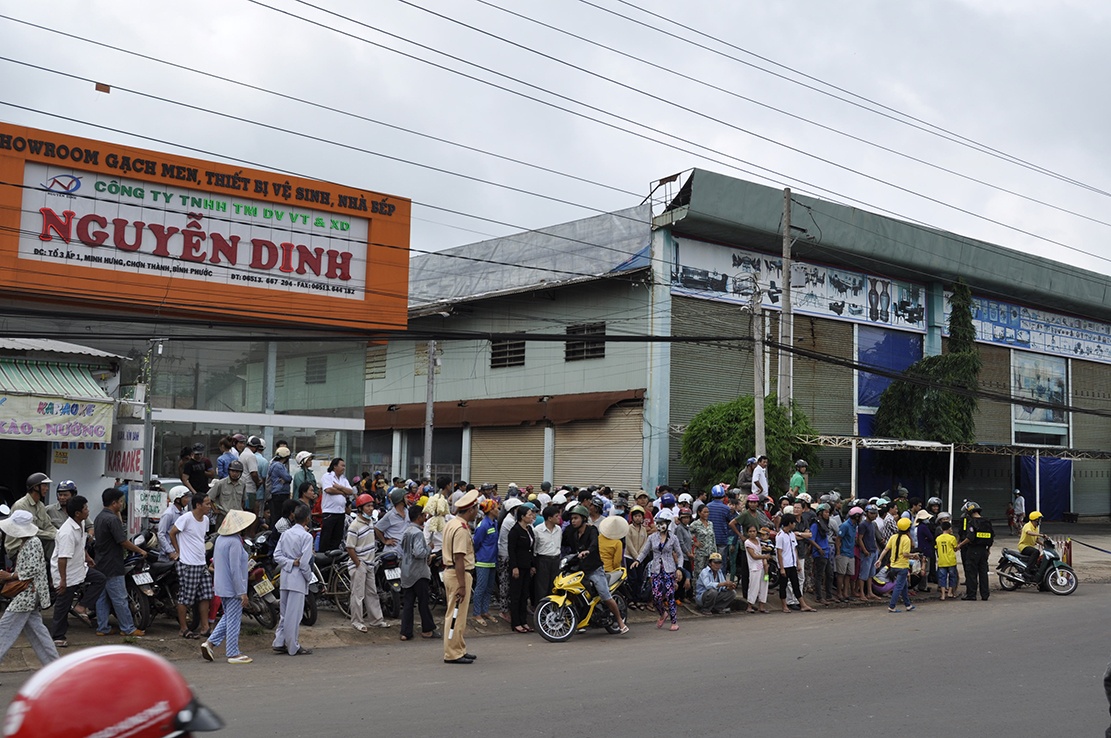 Từ sáng sớm, cảnh sát cơ động giải tỏa hàng trăm người dân tập trung 2 bên quốc lộ 13 để bảo vệ trật tự, chuẩn bị cho các cơ quan chức năng dựng lại hiện trường vụ thảm sát.