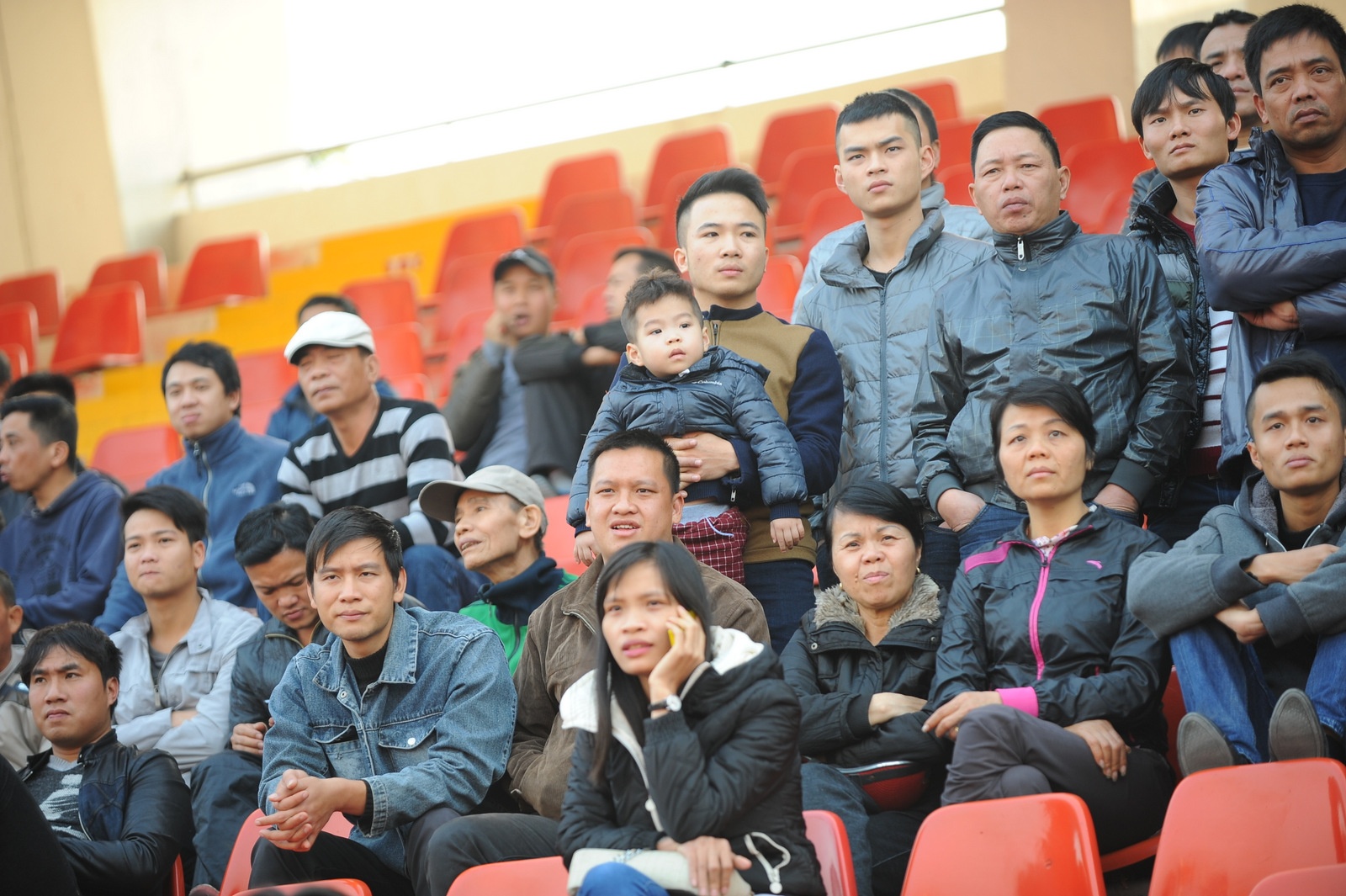 | Hàng trăm người hâm mộ Hải Phòng có mặt trên khán đài theo dõi đội khách tập luyện. |
