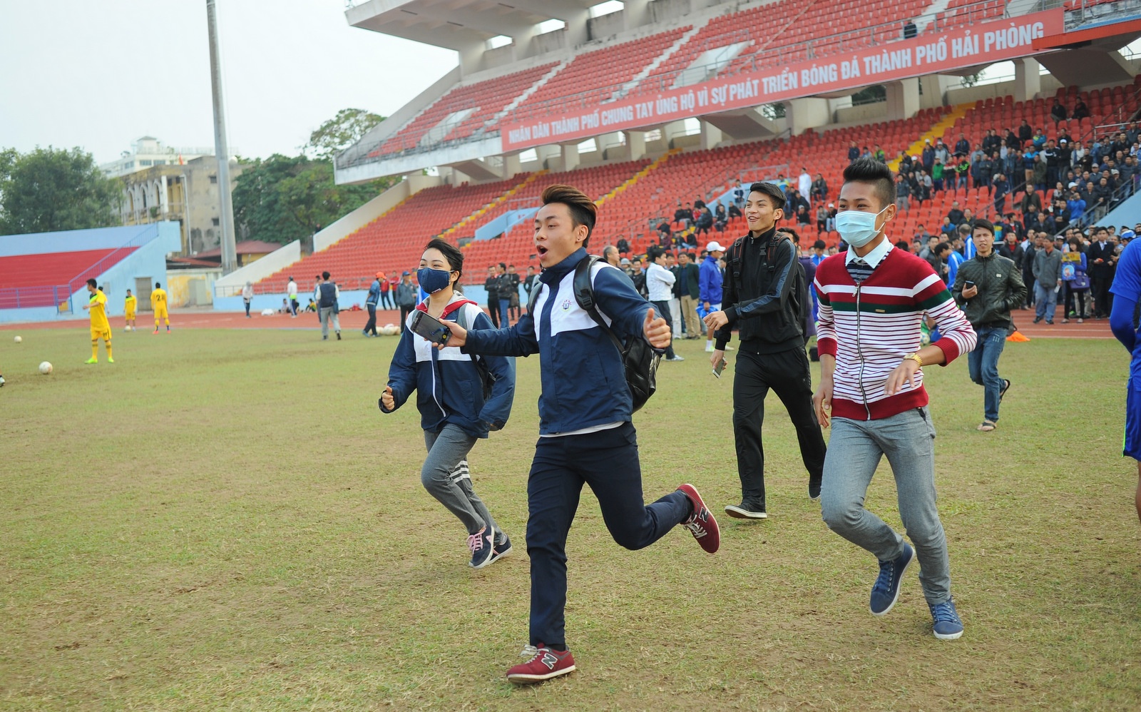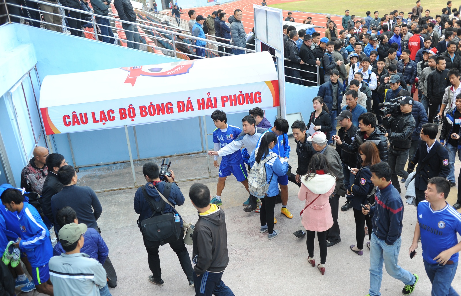 Ngay khi xe ô tô chở đội HAGL tới trước cửa sân Lạch Tray, hàng trăm người hâm mộ đứng kín phía cửa xe và đường dẫn vào sân khiến các cầu thủ HAGL vất vả lách qua.
