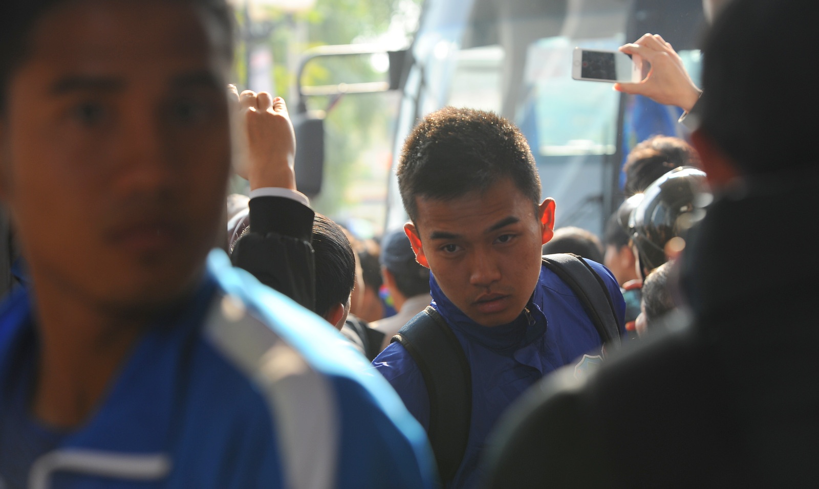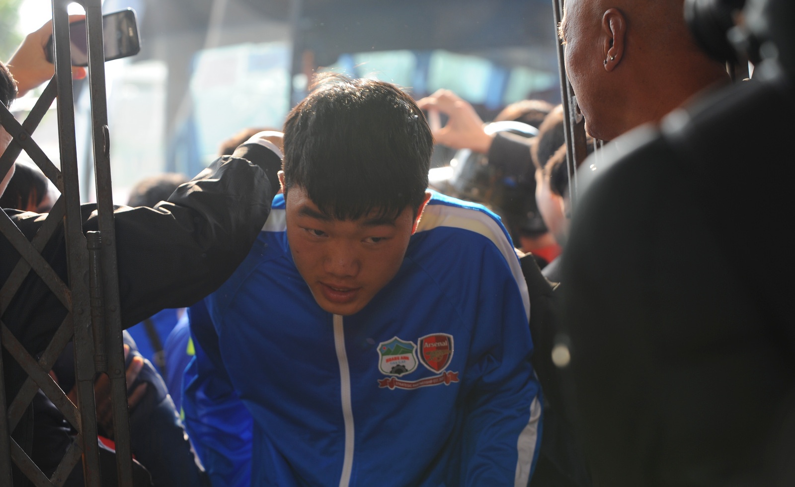 | Đội trưởng Xuân Trường và các đồng đội phải chen qua qua vòng vây của hàng trăm khán giả để vào phía trong sân Lạch Tray chuẩn bị cho buổi tập làm quen mặt cỏ thi đấu. Lực lượng an ninh lập tức đóng cửa sân để ngăn khán giả ùa vào theo các cầu thủ. |