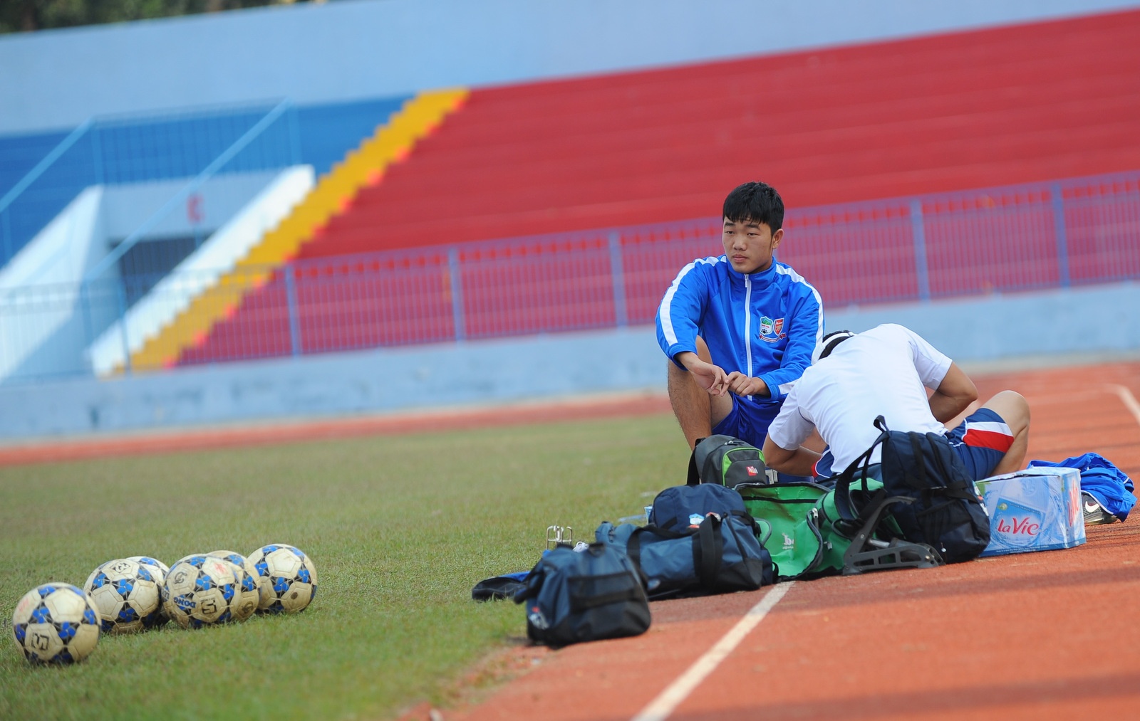 | Đội trưởng Xuân Trường bị đau cổ chân, anh chỉ có thể ngồi quan sát các đồng đội tập luyện. |