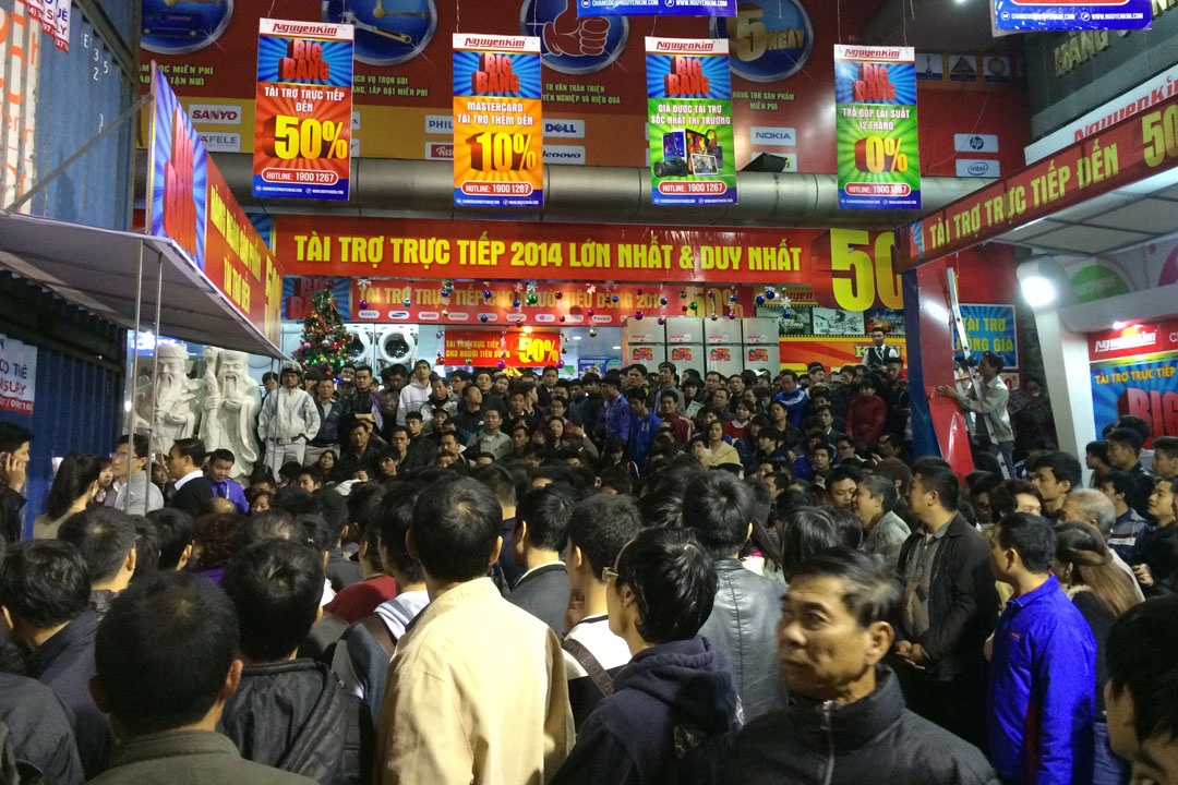 | Đây là cảnh chen lấn tại siêu thị Nguyễn Kim (Tràng Thi, Hoàn Kiếm). Ước tính, có khoảng vài trăm người đến và tham dự bốc thăm để mua 10 chiếc Lumia 535 với giá 535.000 đồng. |