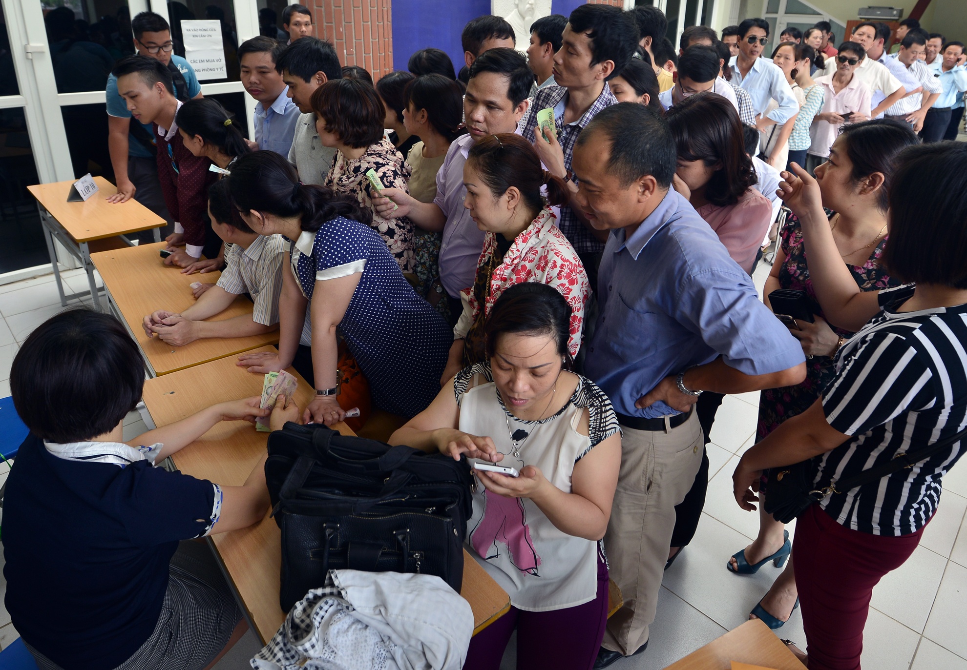 Hàng trăm phụ huynh chen lấn, chờ đợi cả tiếng đồng hồ để mua được bộ hồ sơ dự tuyển vào lớp 6 và lớp 10 trường dân lập Lương Thế Vinh, Hà Nội.