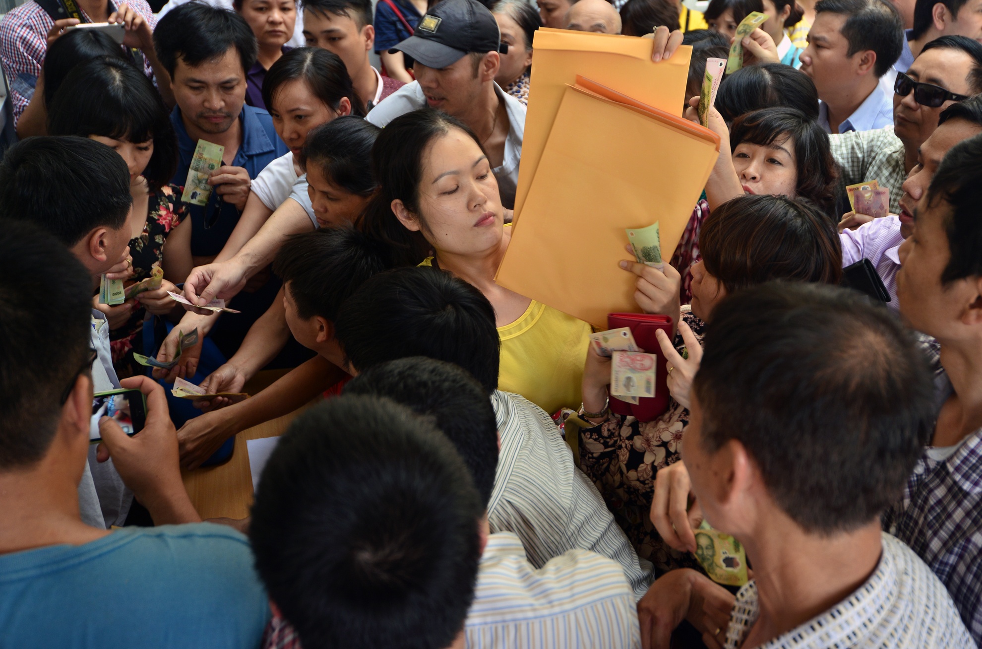 Phụ huynh sốt ruột ngó vào trong phòng làm việc, nơi các nhân viên của trường dân lập Lương Thế Vinh đang chuẩn bị đợt bán tiếp theo.