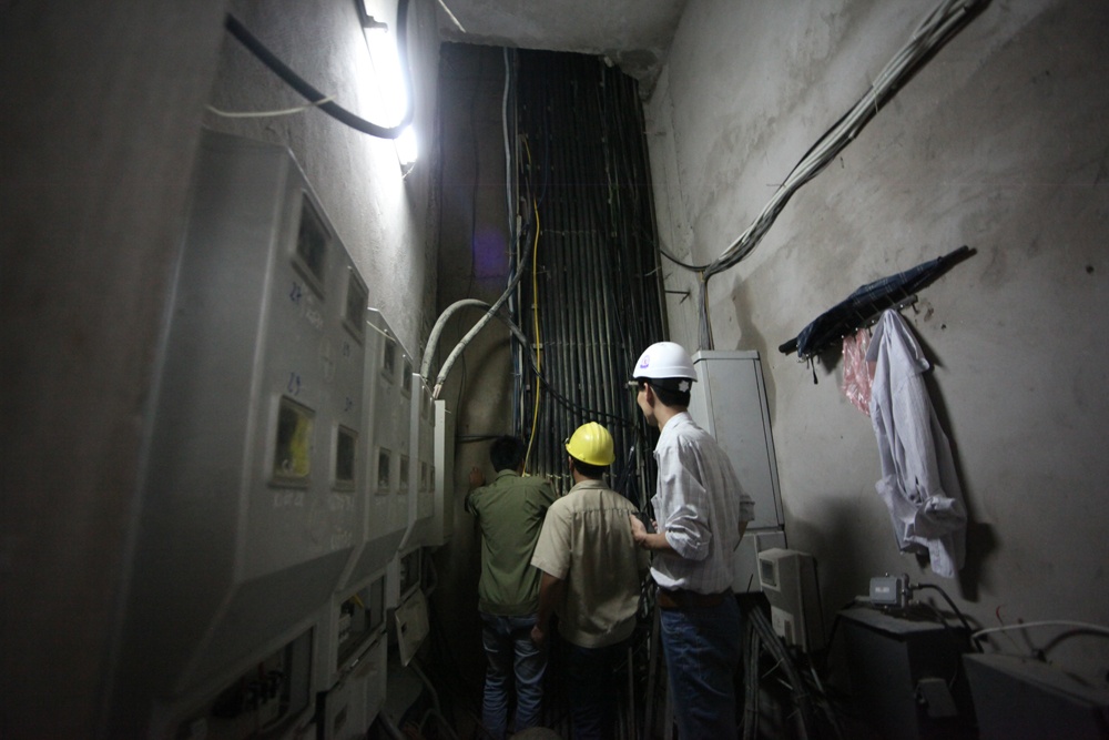 Theo anh Phấn, tổ trưởng quản lý tòa nhà CT4B, hệ thống thang máy bị nước chảy lênh láng từ một hộ dân tầng 16 làm chập điện thang máy.
