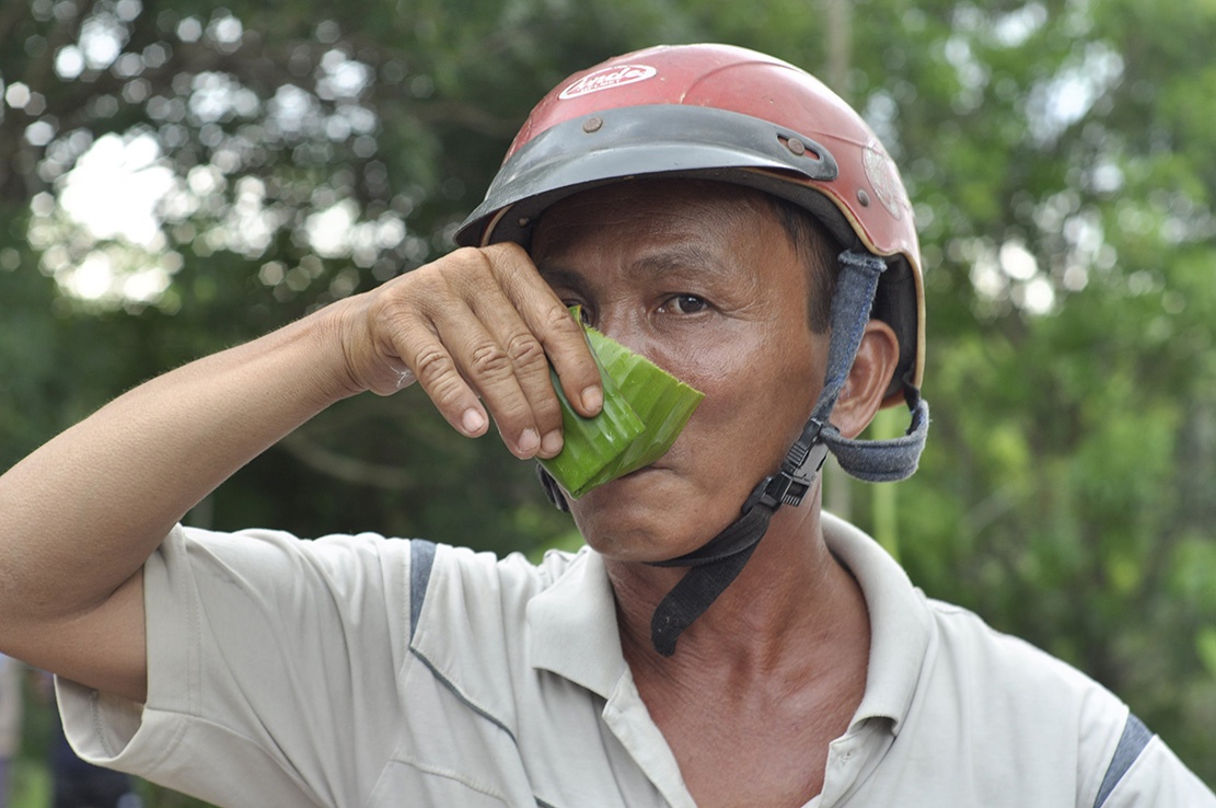 | Một người dân nếm thử nước giếng tự phun và cho biết nó có vị mặn và mùi hơi tanh. |