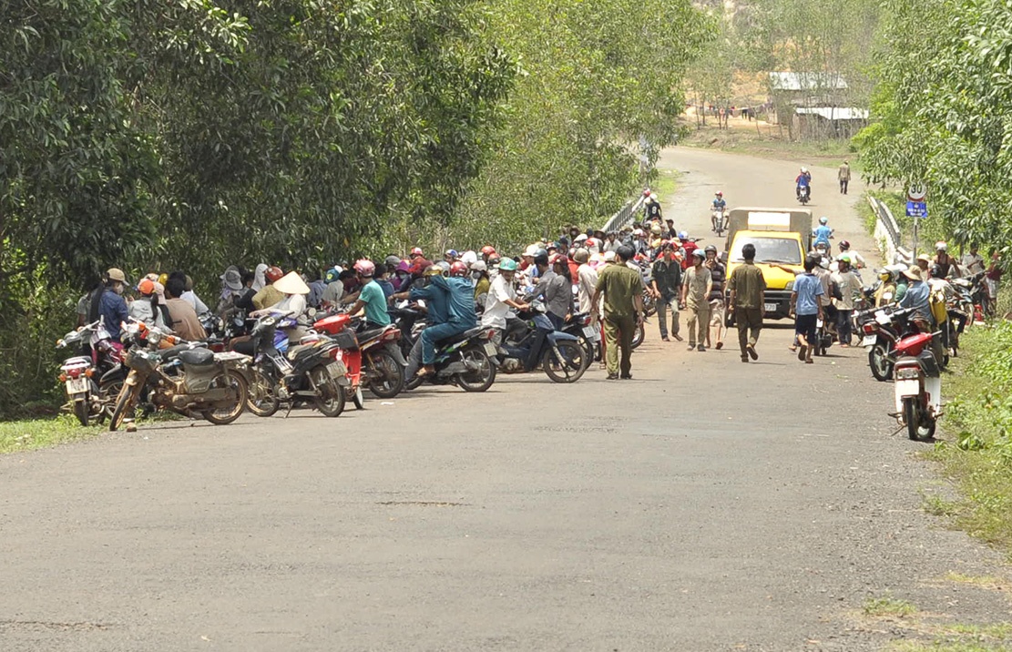 | Chiều 2/6, người dân tiếp tục đổ về xem giếng tự phun. Lực lượng chức năng xã Đá Bạc có mặt giữ gìn an ninh trật tự. |