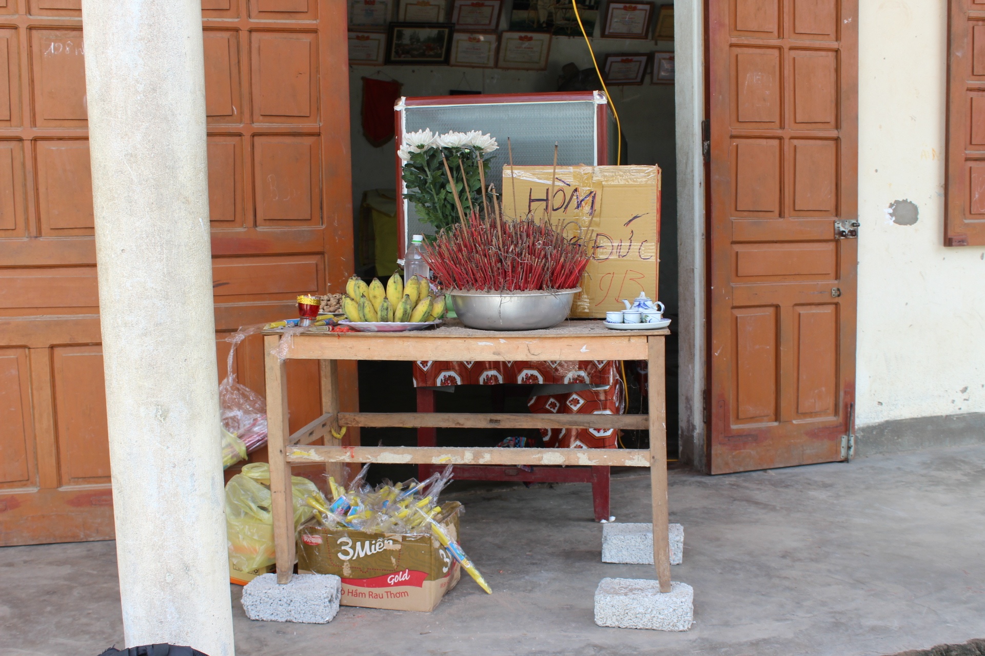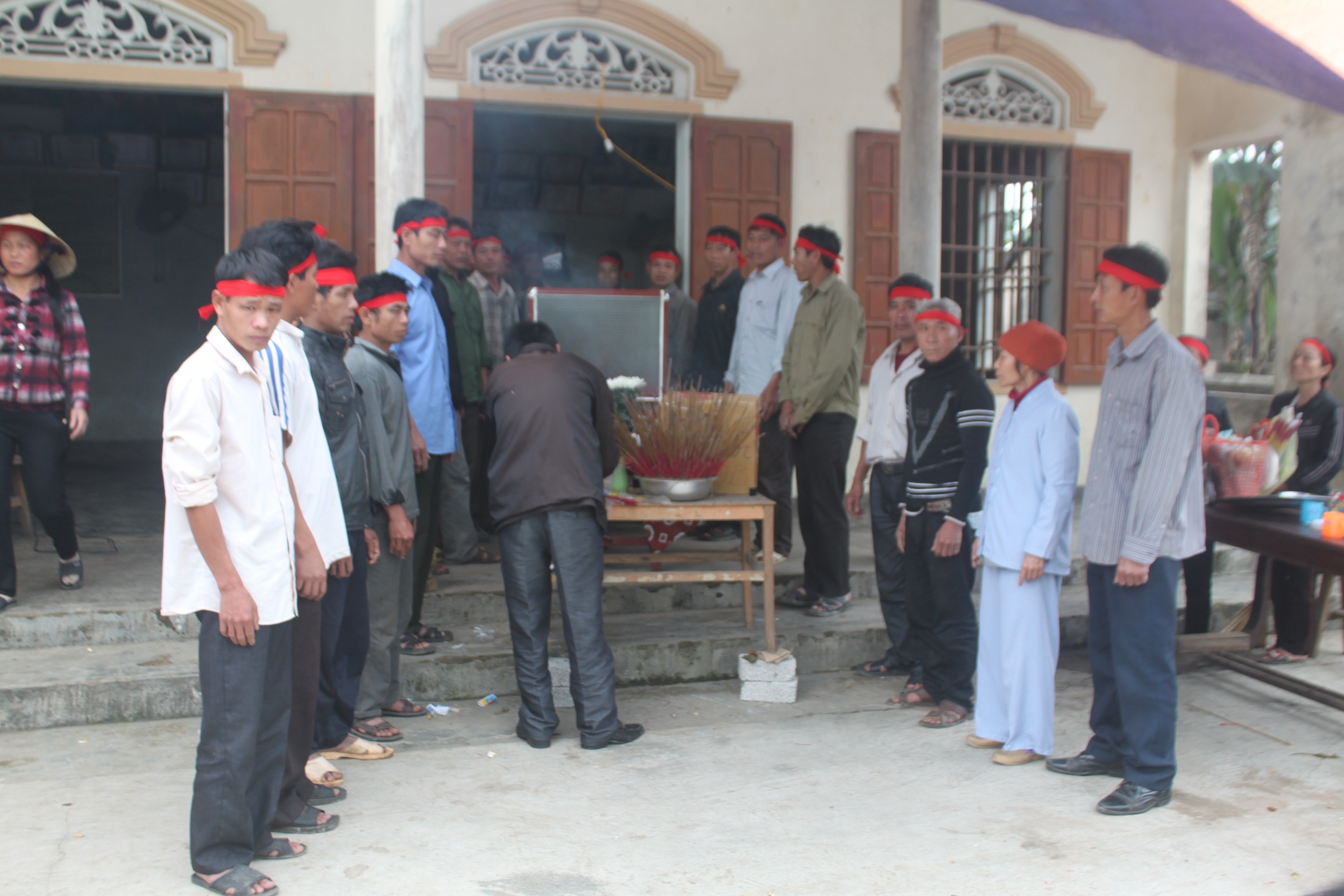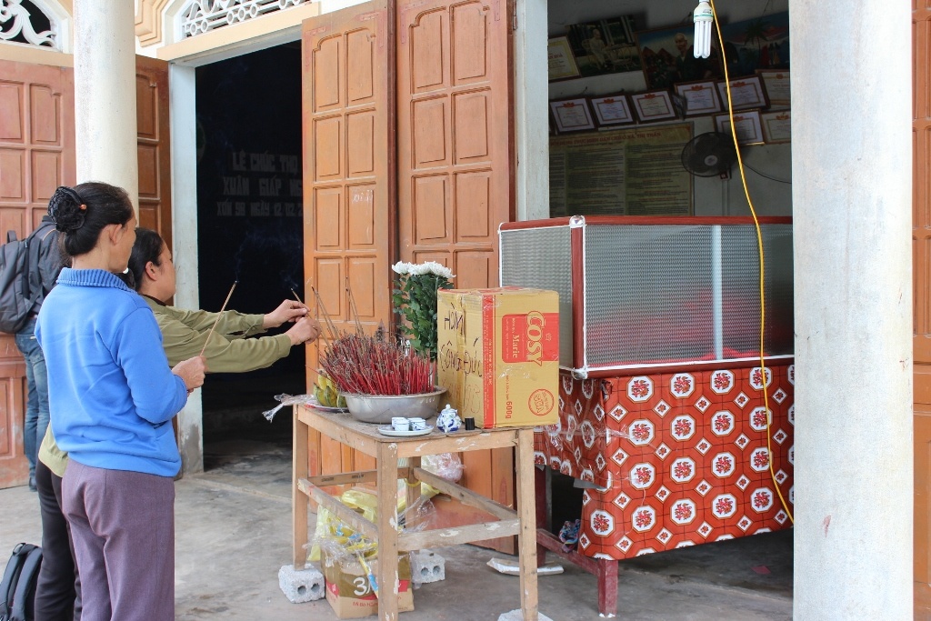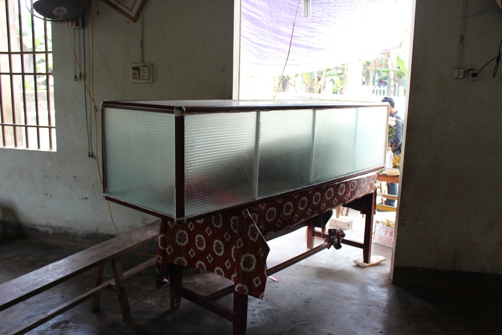| Chính vì vậy ngư dân trong vùng tổ chức mai táng cho "Ngài" rất cẩn thận, với một lòng thành kính thực sự. Sau khi được vớt lên đưa về nhà văn hóa xóm, cá được bỏ vào tủ kính, lập bàn thờ để bà con đến thắp hương. |