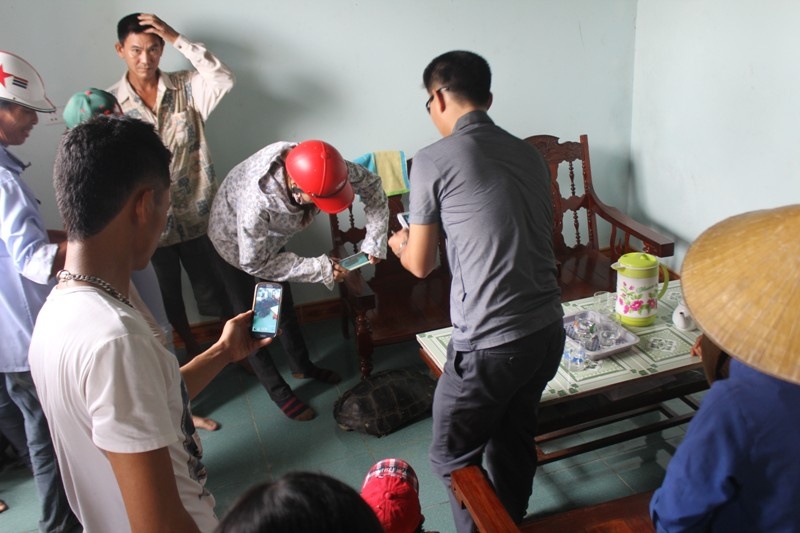 | Sáng ngày 25/9, có rất đông người tập trung tại nhà gia đình bà Thái Thị Năm (SN 1969, ở xã Liên Thành, huyện Yên Thành, Nghệ An) để tận mắt xem một con rùa mà gia đình bà mới bắt được. |