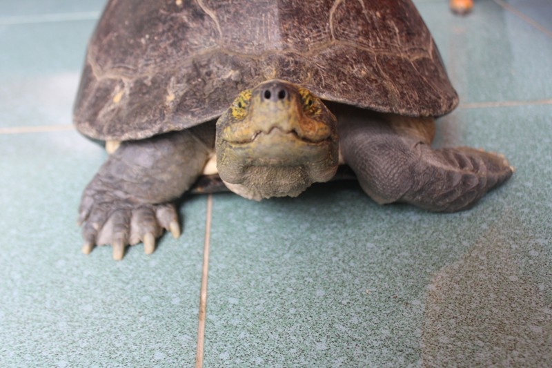 | Chú rùa tỏ ra nhanh nhẹn, di chuyển khá nhanh. Theo lời kể của bà Năm, con rùa này bỗng dưng xuất hiện trước cửa nhà bà cách đây 4 ngày. “Khoảng 2h sáng ngày 22/9, tôi đang ngủ say thì có tiếng cho sủa ở ngoài. nghĩ là có trộm nên tôi vội vàng dậy xem. Tuy nhiên khi mở cửa thì chẳng thấy bóng dáng ai cả nên tôi lại vào ngủ tiếp. Thế nhưng chó tiếp tục sủa, thấy lạ tôi càm đèn pin ra ngoài cỏng để xem thì phát hiện một con rùa đang ngóc đầu lên nhìn tôi”, bà Năm nhớ lại. |
