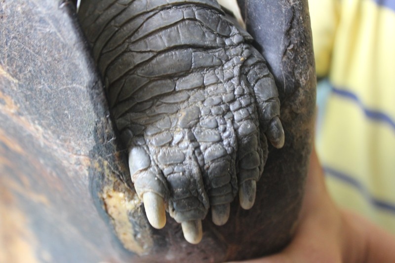 Theo những người đến xem, thì con rùa này có thể đến 100 năm tuổi, chân có móng vuốt. Khi đặt lên bàn cân thì thấy con rùa nặng 12kg.