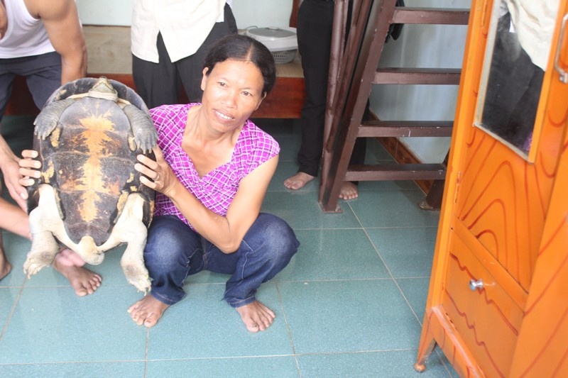 | Bà Năm ôm con rùa mà bà phát hiện thấy ở cổng nhà mình. |