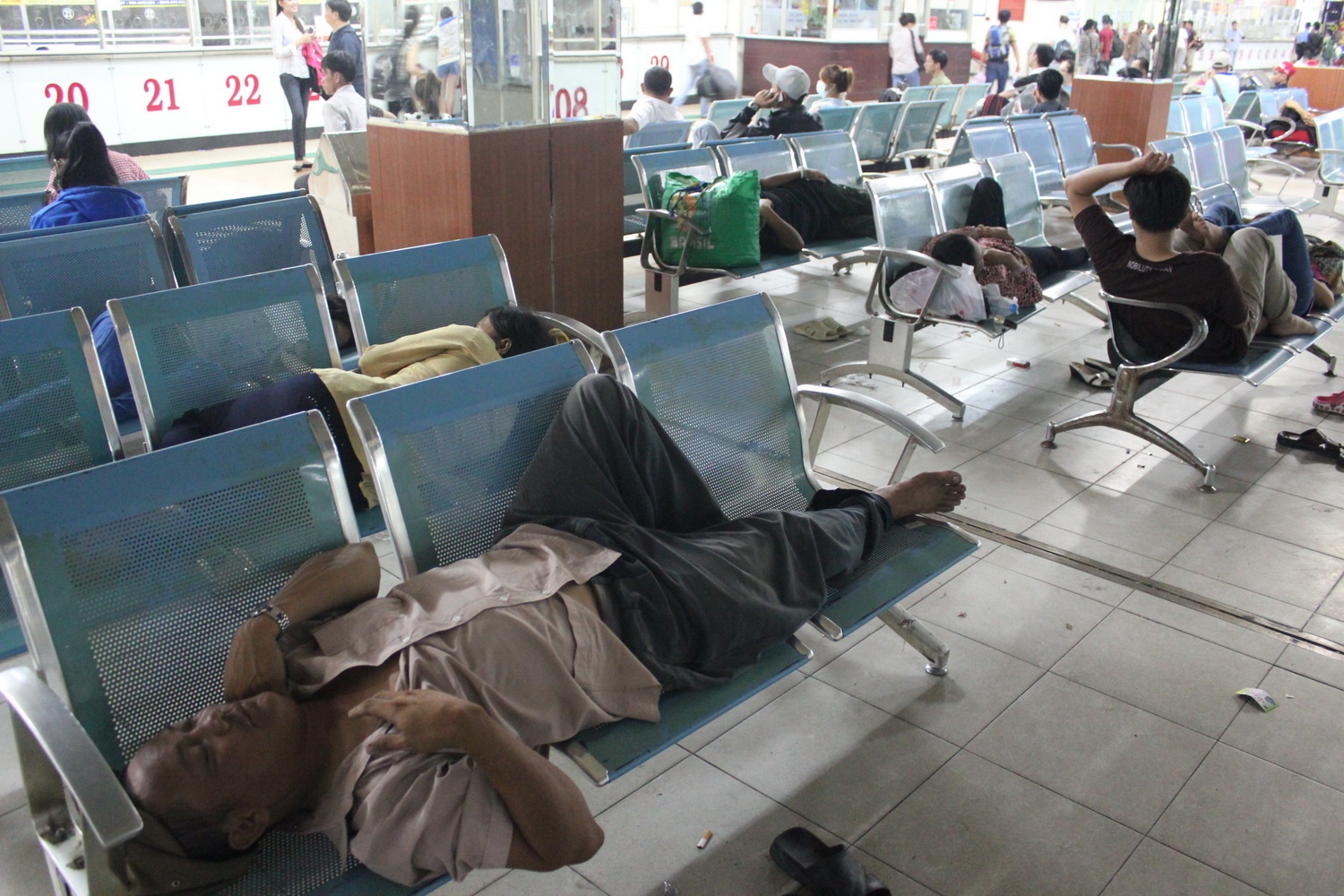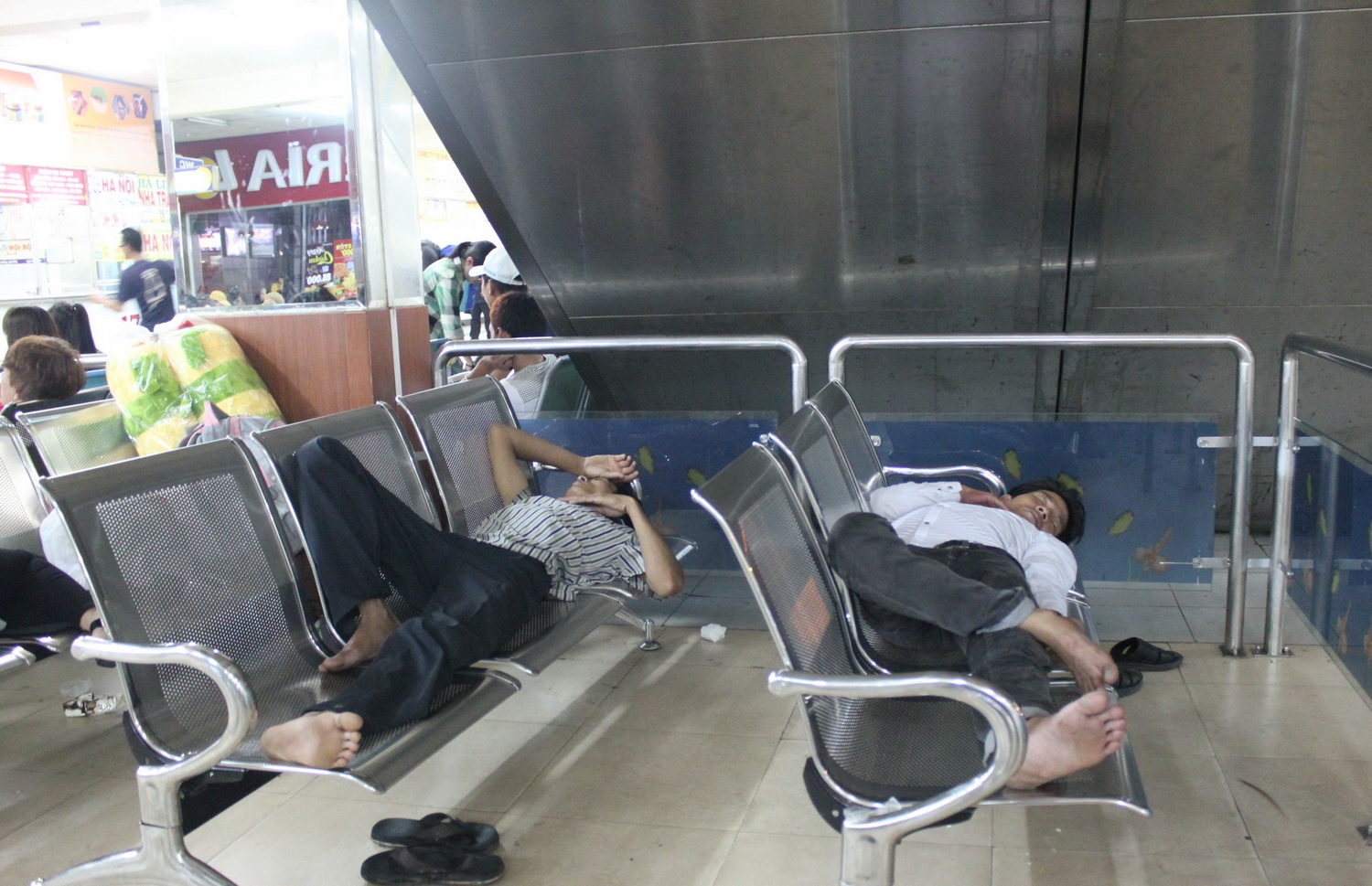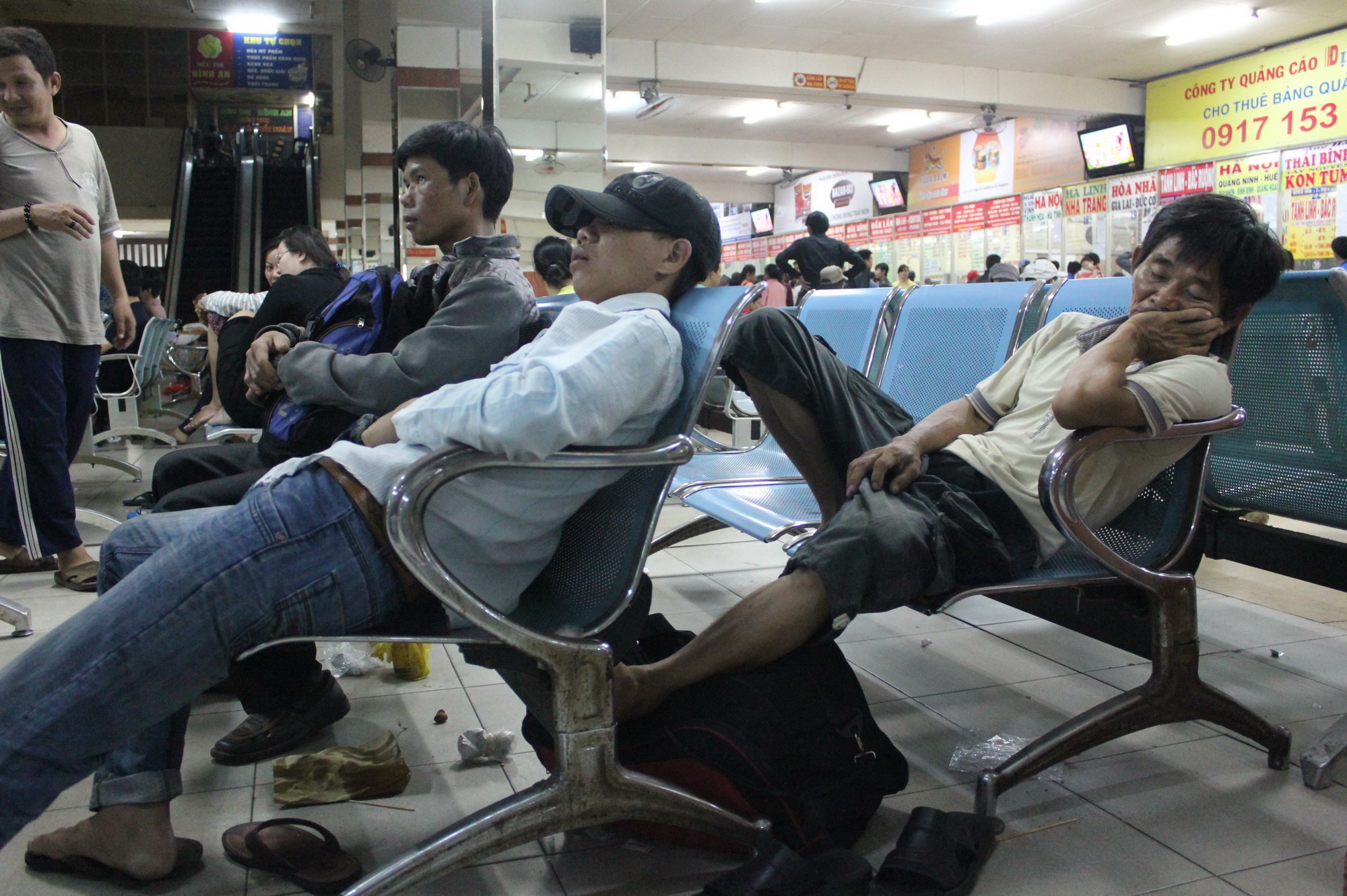 | Sau một ngày làm việc mệt nhọc, mòn mỏi do chờ đợi mua vé, rồi chờ xe chạy khiến nhiều người có thể ngủ rất dễ dàng. |