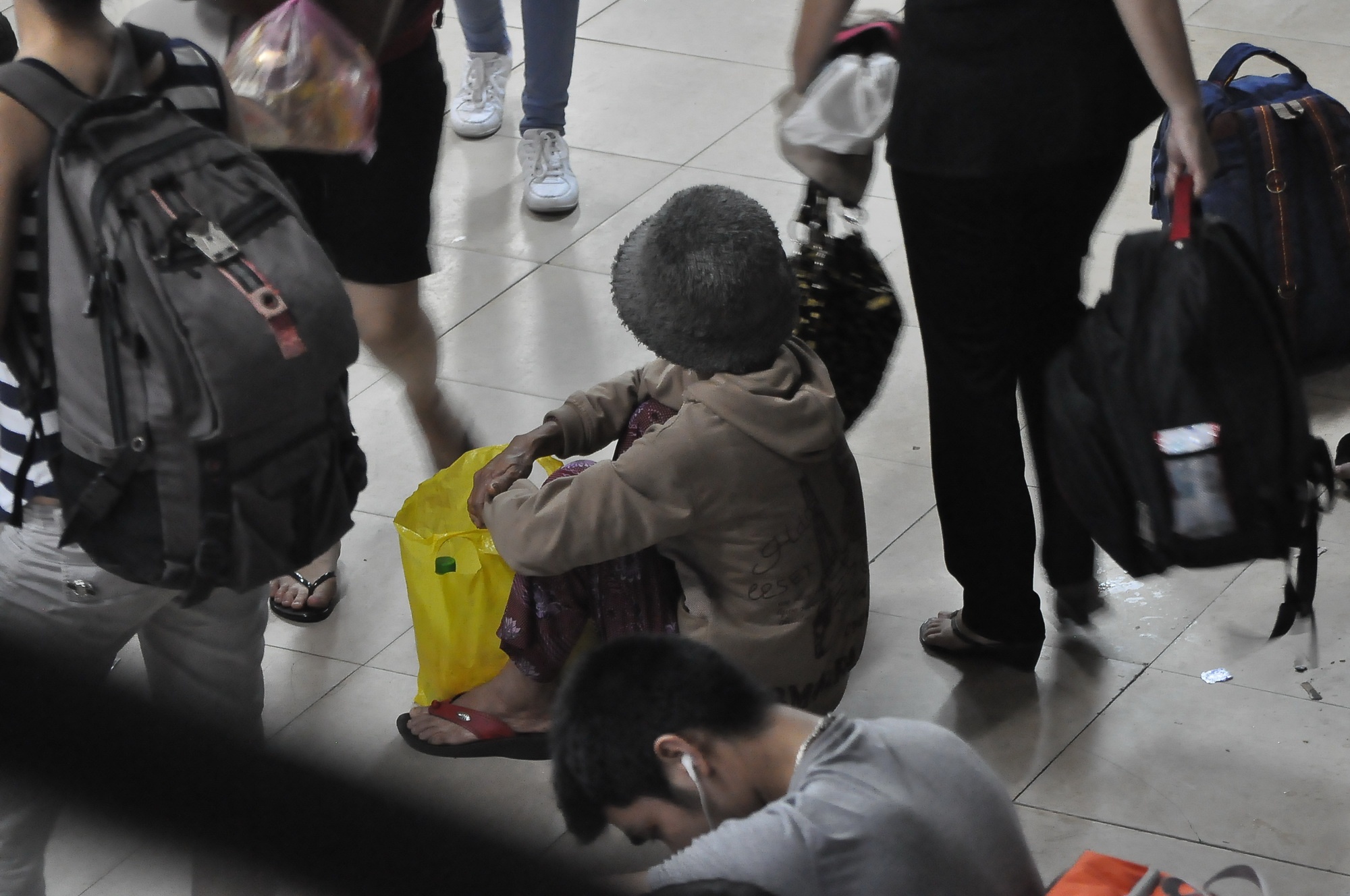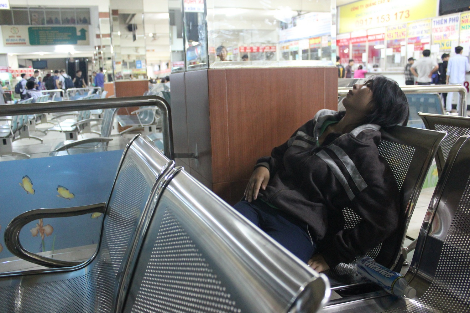 | Nằm ngay trên ghế chờ bến xe để ngủ |