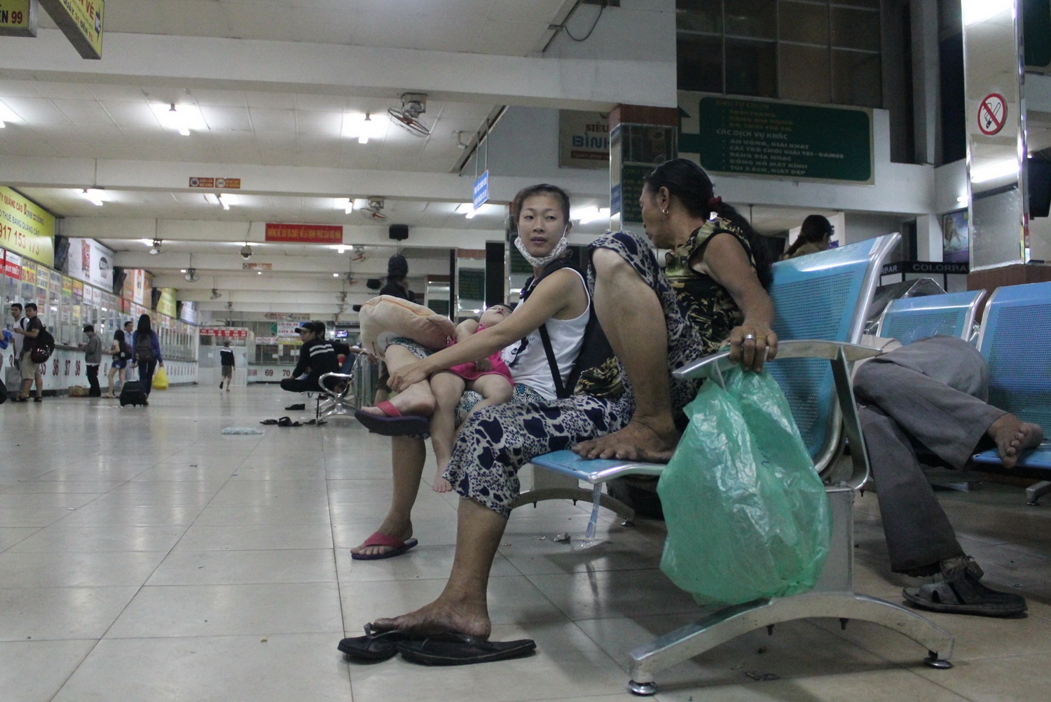 | Một phụ nữ bế theo con nhỏ đang ngủ chờ chuyến xe lúc nửa đêm để về Ninh Thuận vào rạng sáng. |