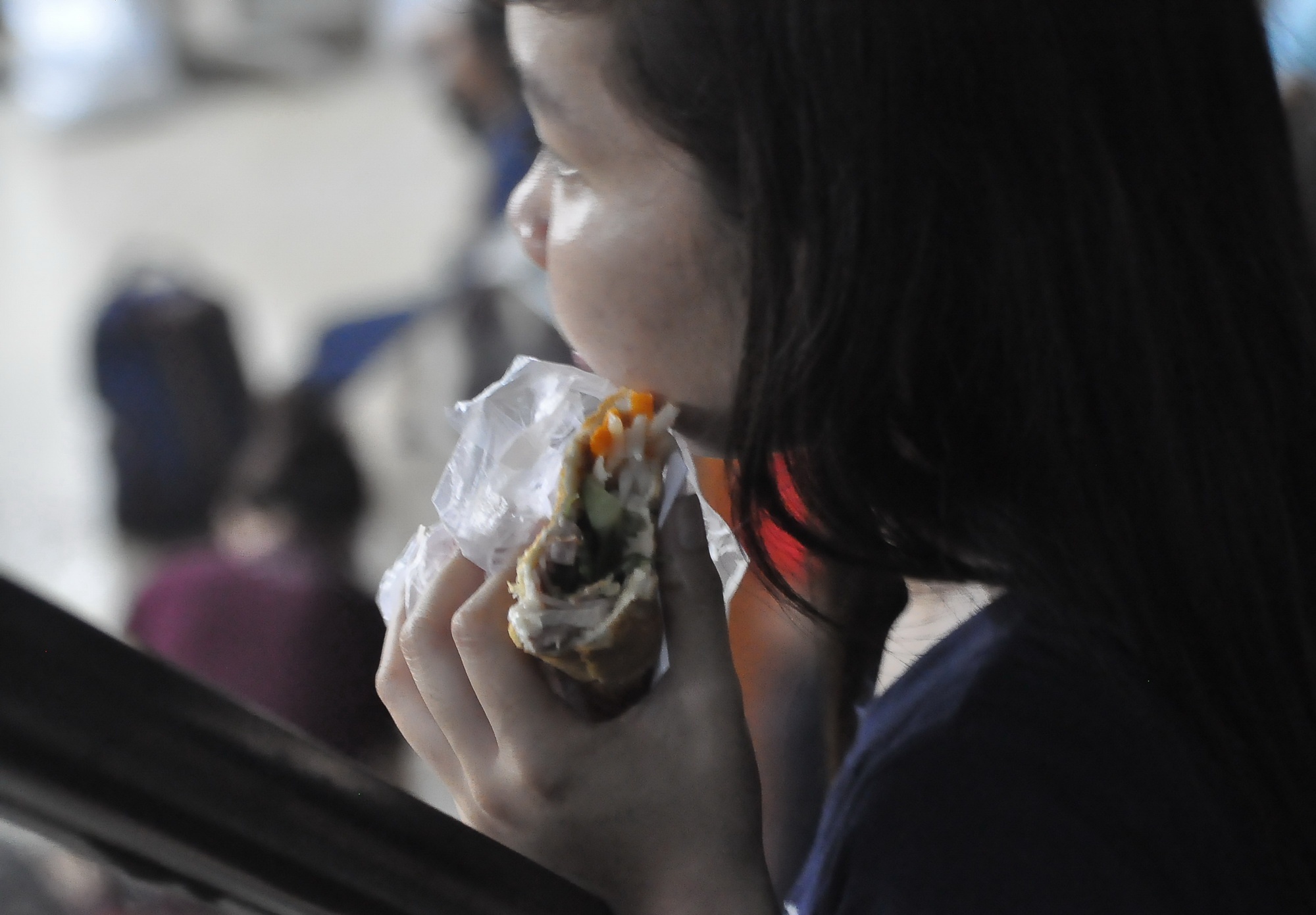 | Tâm (sinh viên Đại học Công Nghiệp) vừa ăn tạm bánh mì vừa dõi theo người bạn của mình đang xếp hàng mua vé để về Bình Thuận |