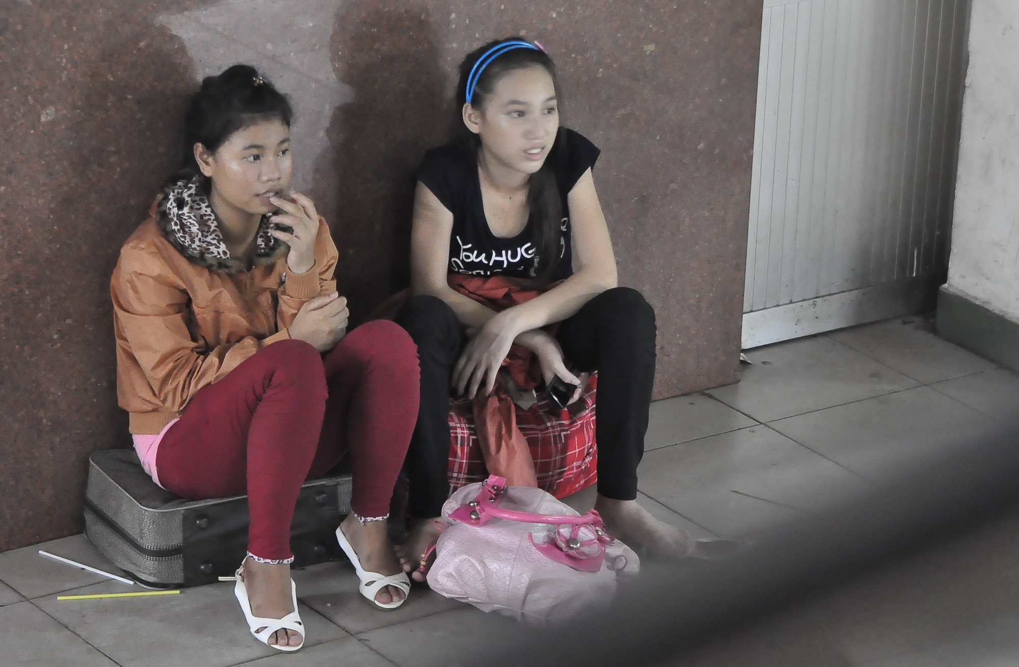 | Hai cô gái bị lỡ cơ hội về quê sớm, phải ngồi chờ xe chưa biết lúc nào tới. |