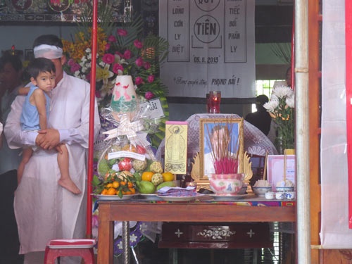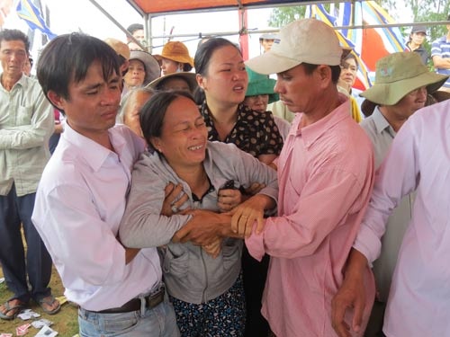 | Bé Trần Chí Khang cùng cha bên quan tài của mẹ. Còn chồng Sen, anh Trần Ngọc Trang, như người mất hồn. Nhìn những nắm đất, nắm cát bà con đến viếng lần lượt thả xuống huyệt mộ của vợ mình, anh bật khóc. “Vợ ơi, em hãy yên nghỉ”, vừa nói, chồng Sen vừa đưa tay lau vội những giọt nước mắt đớn đau. Hai người cha ruột và cha chồng của Sen cũng không kìm được nước mắt. Mọi người ở cạnh Sen trong chiều nay ôm nhau khóc nức nở. |