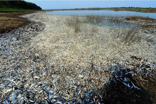 | Hàng trăm nghìn con cá chết trên sông Fuhe, đoạn chảy qua thành phố Vũ Hán, tỉnh Hồ Bắc, Trung Quốc do hóa chất thải ra từ một nhà máy ở đây. Ảnh: China.org |