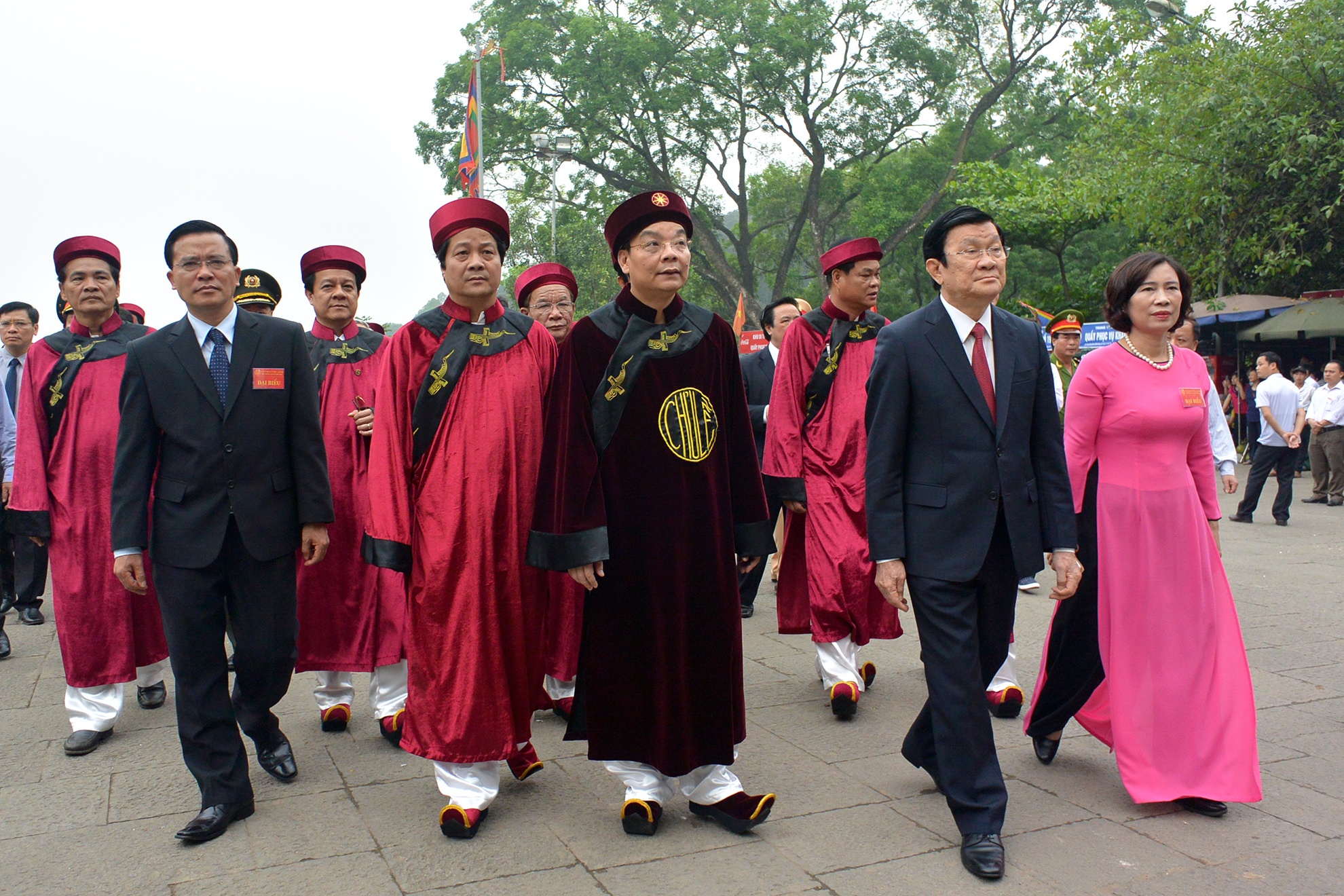 | Chủ tịch nước Trương Tấn Sang dẫn đầu đoàn đại biểu Nhà nước tham dự Lễ hội Đền Hùng 2015. |
