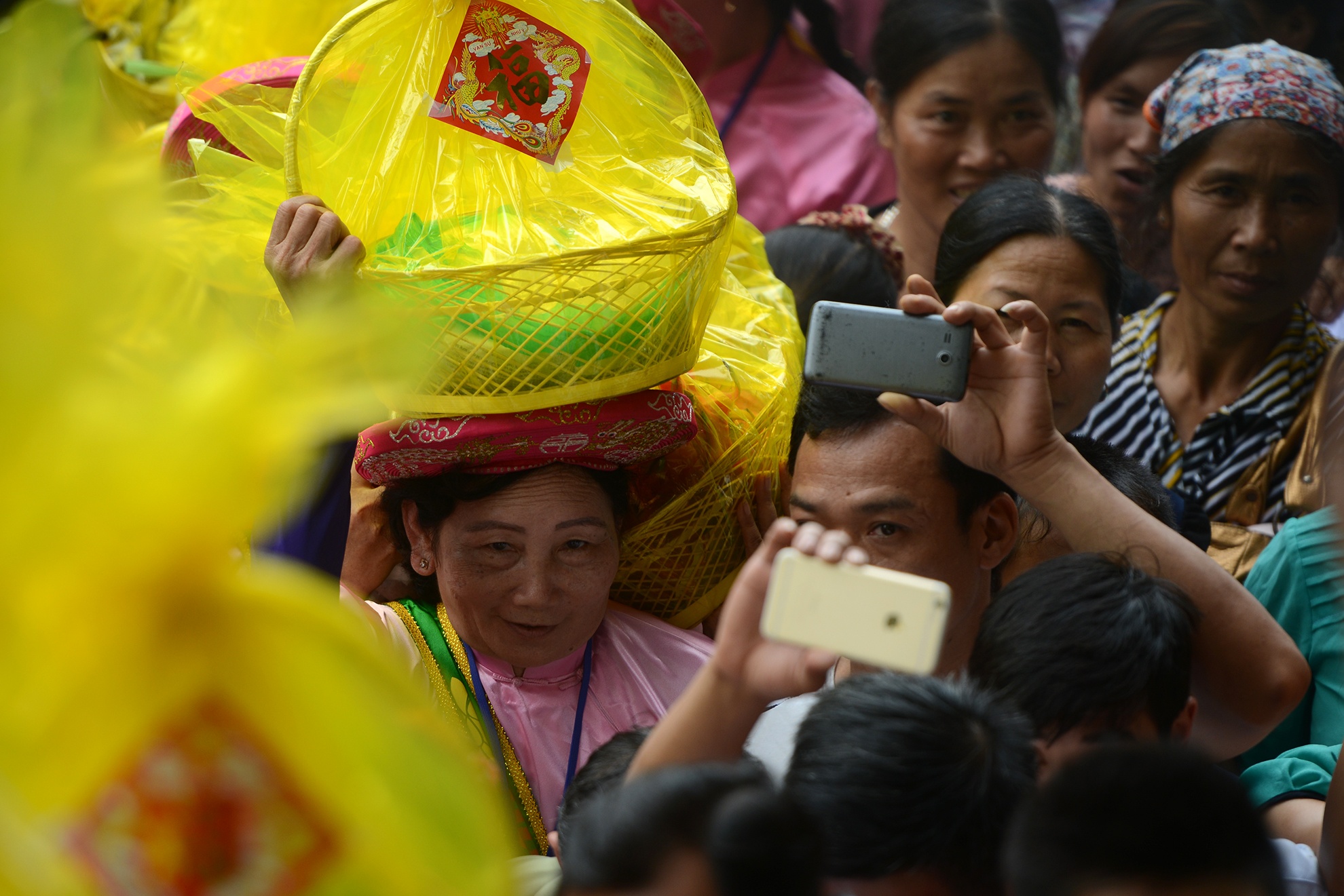 | Đông đảo người dân có mặt từ rất sớm, theo dõi đoàn rước và chờ lên dâng hương làm lễ tại cổng chính. Dự kiến khoảng 2 triệu lượt người hành hương về đất Tổ trong ngày hôm nay. |