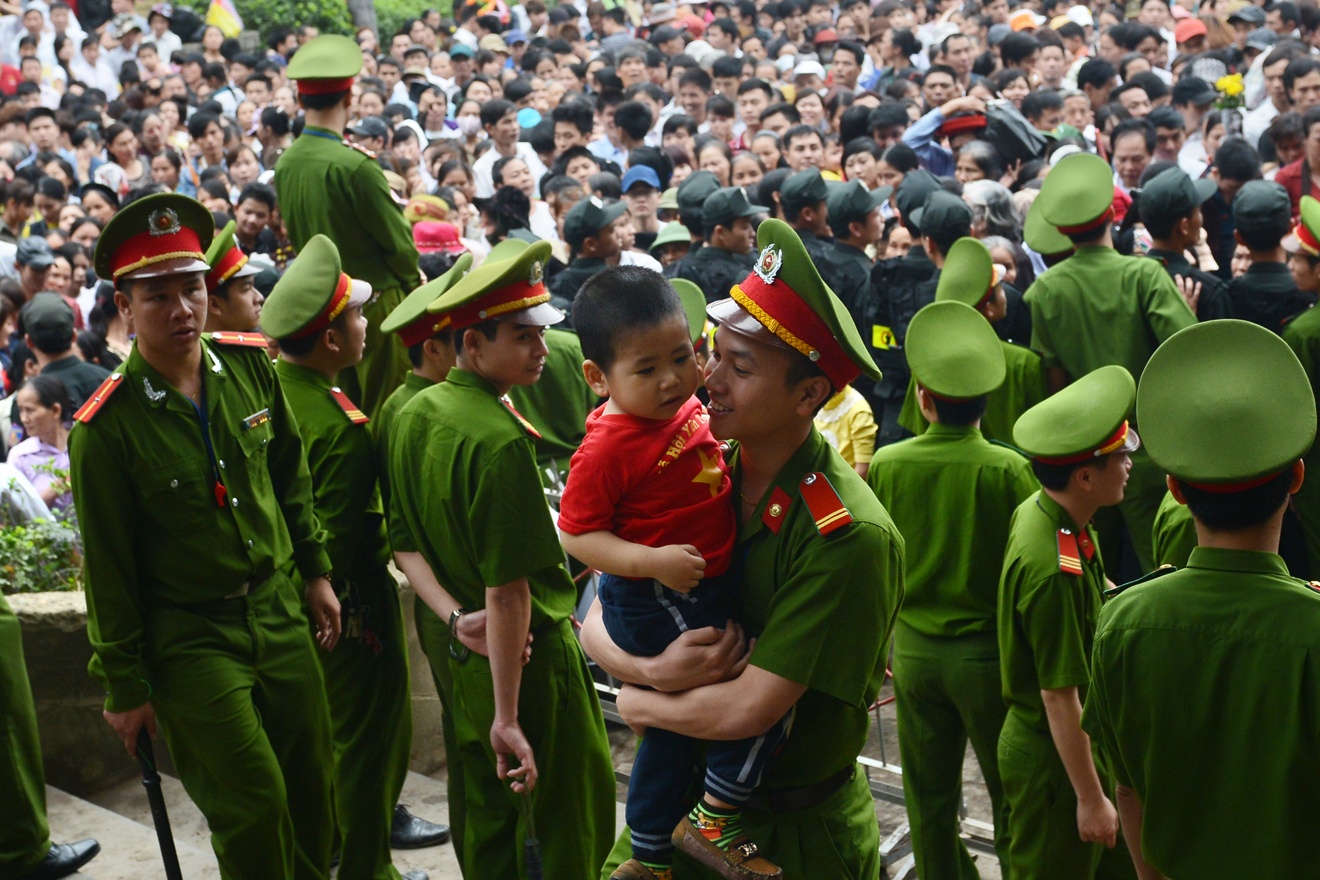 | Một bé trai được công an đưa lên trên trước để chờ bố mẹ lên sau, tránh cảnh chen chúc ngột ngạt. |