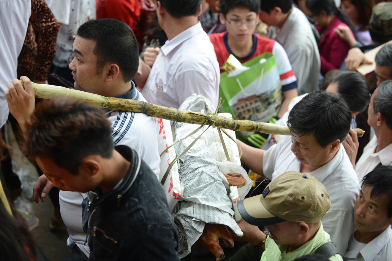 | Nhiều người còn vác theo cả lợn quay lên Đền giữa dòng người chật cứng. |