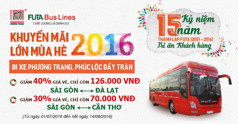 Chương trình “Đi xe Phương Trang, phúc lộc đầy tràn” tổ chức nhằm kỷ niệm 15 năm thành lập hãng xe, 10 năm mở tuyến liên tỉnh đầu tiên tại Đà Lạt và 8 năm mở tuyến Cần Thơ. Giá vé cho tuyến Sài Gòn - Đà Lạt giảm còn 126.000 đồng/vé, giá vé Sài Gòn - Cần Thơ giảm còn 70.000 đồng/vé. Giá được giảm trực tiếp tại các quầy vé của Phương Trang hoặc khi đặt vé qua website, app FUTA Bus.