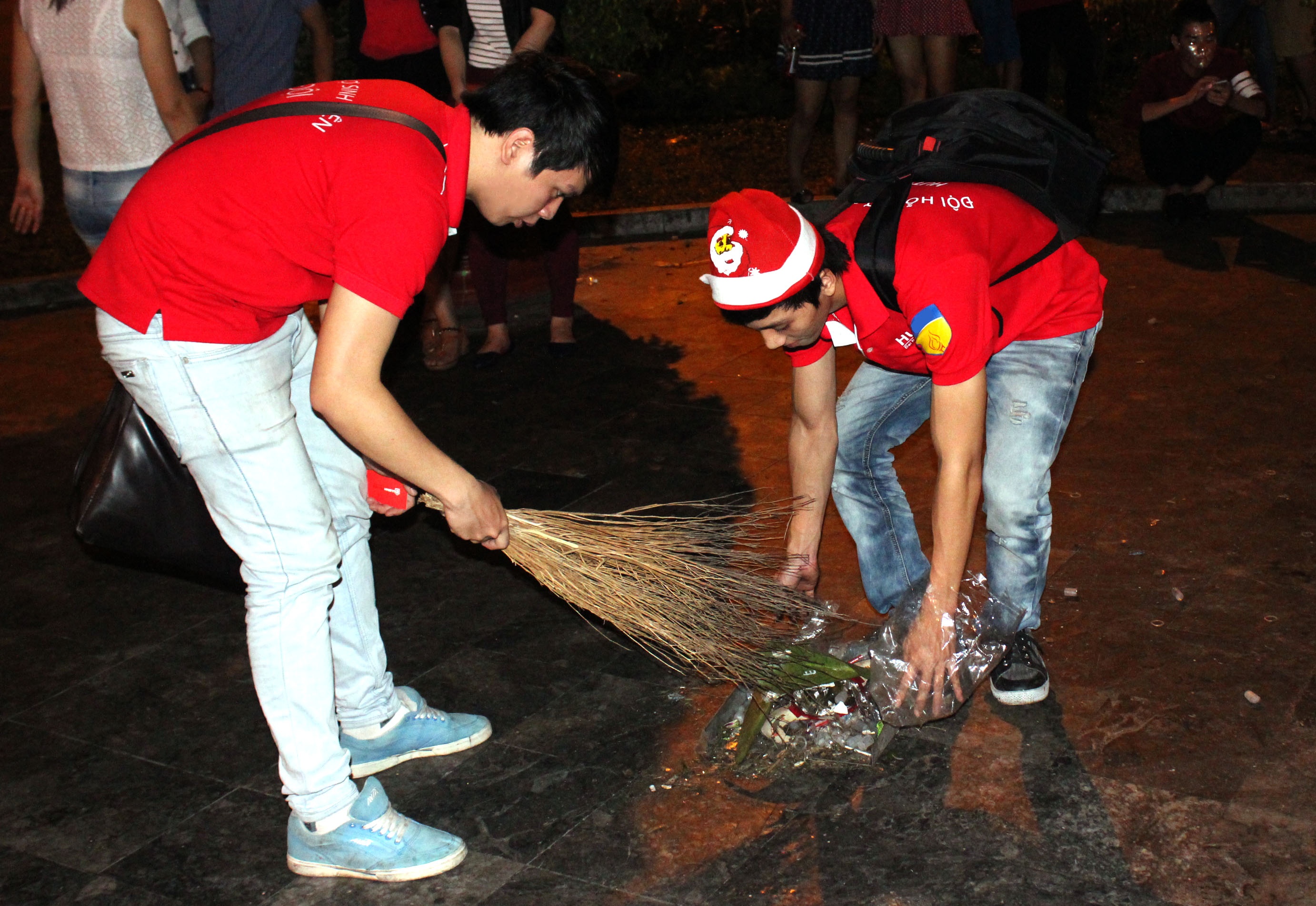 Một nhóm sinh viên đã tình nguyện ở lại khu vực nhà thờ Đức Bà để quét dọn, thu gom rác dù đồng hồ đã điểm qua 0h.