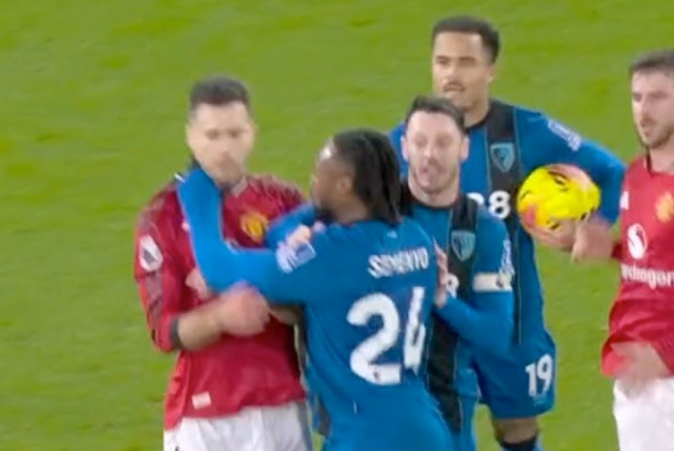 Tiền đạo của Bournemouth tỏ ra tức giận và lao về phía Dalot sau một tình huống va chạm mạnh. Các góc quay cho thấy Semenyo vung tay về phía cổ Dalot, với động tác giống như định bóp cổ, khiến các cầu thủ hai đội phải nhanh chóng can thiệp.