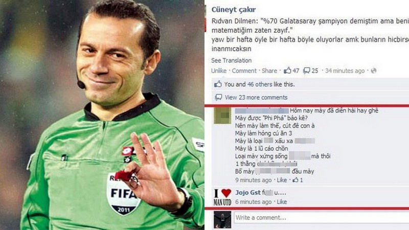 Hồi tháng 3 vừa qua, ngay sau khi trận đấu giữa MU với Real Madrid ở vòng 1/8 Champion League kết thúc không như ý, nhiều fan Việt Nam đã ngay lập tức tìm ra fanpage của vị trọng tài người Thổ Nhĩ Kỳ người được cho là mang đến trận bóng xui xẻo này - ông Cuneyt Cakir và không ngần ngại buông những lời lẽ hết sức khiếm nhã, xúc phạm tới danh dự ông.