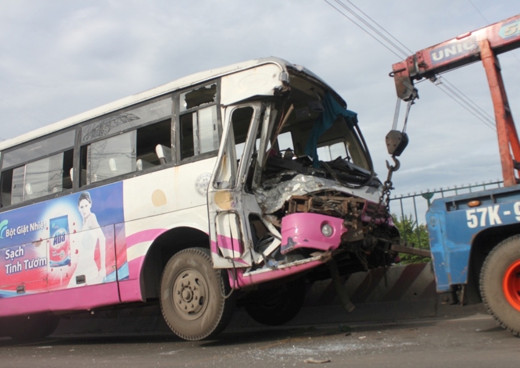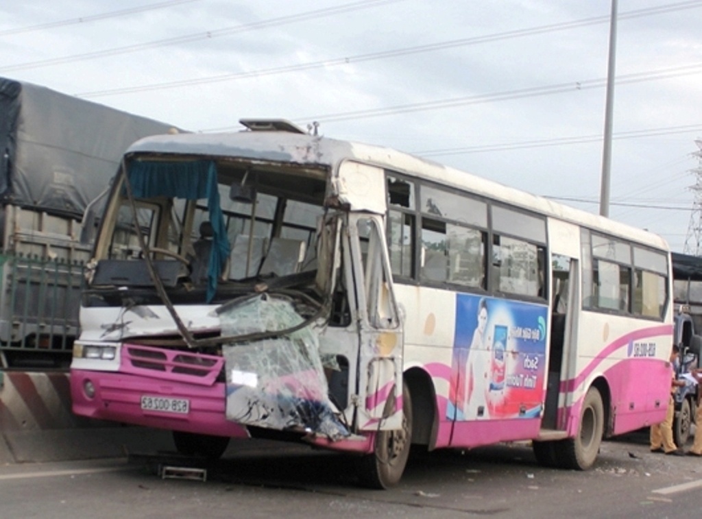 Tuy nhiên, tài xế xe khách bất ngờ mất lái đã đâm thẳng vào đuôi chiếc xe tải trên. Liền đó một xe tải khác do tài xế Hồ Văn Tuấn (SN 1979, quê Tiền Giang) điều khiển phía sau không kịp xử lý tình huống nên đâm thẳng vào đuôi xe khách.