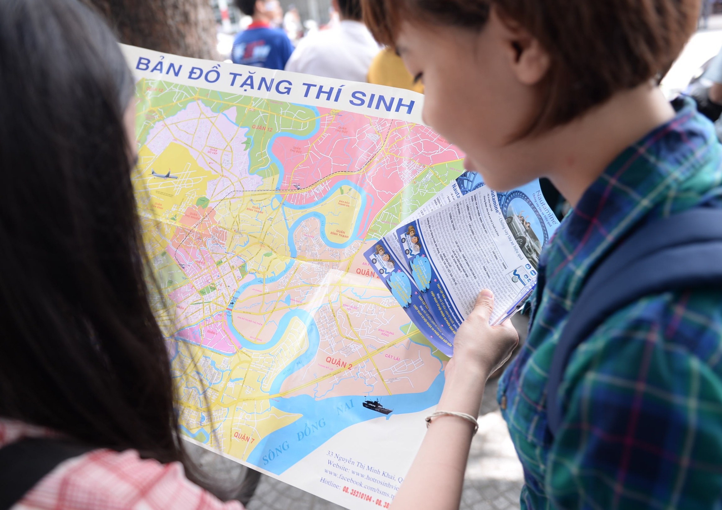 Năm nay, với quy chế thi mới được ban hành, gộp hai kỳ thi tốt nghiệp THPT và tuyển sinh đại học thành một kỳ thi duy nhất, các bạn thí sinh đã có thể dễ thở hơn khi chỉ phải tập trung ôn thi một lần và không phải di chuyển quá xa để thi. Tuy nhiên, số lượng hơn 90.000 thí sinh từ 7 tỉnh thành lân cận tập trung về TP HCM để dự thi cũng không phải là ít. Chính vì vậy, những hoạt động tiếp sức mùa thi năm nay vẫn diễn ra sôi động. Trong đó, chương trình phát tặng bản đồ TP HCM do Hành trình 4 mùa yêu thương tổ chức, vẫn là một trong những hoạt động không thể thiếu.