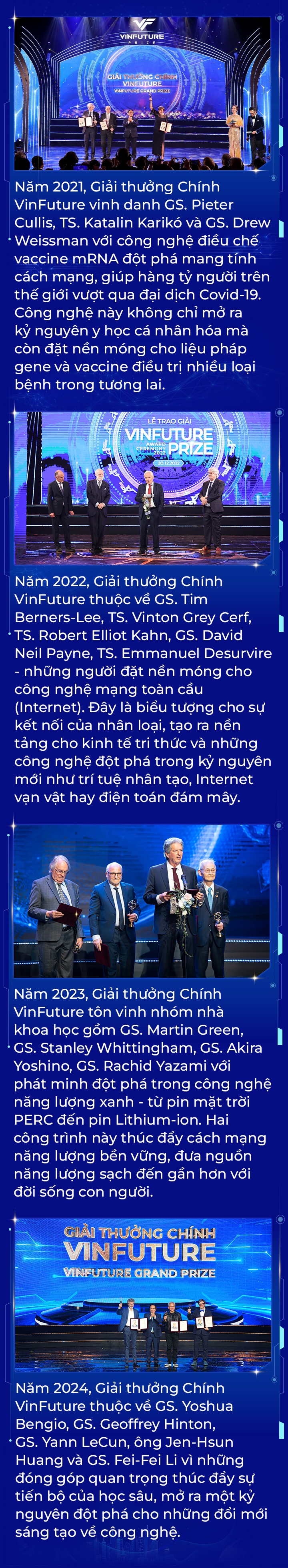 Nếu các số liệu nói trên đã phản ánh tầm ảnh hưởng ngày càng mở rộng trên phạm vi toàn cầu của Giải thưởng VinFuture, thì những công trình đoạt giải lại kể câu chuyện về tầm vóc, sứ mệnh độc đáo và rất nhân văn của VinFuture: Tôn vinh những phát minh khoa học góp phần cải thiện cuộc sống tốt đẹp hơn cho hàng tỷ người trên hành tinh. Mỗi mùa giải, VinFuture đều vinh danh công trình gắn với bước ngoặt phát triển của nhân loại - từ công nghệ Internet, pin mặt trời PERC và công nghệ lưu trữ bằng pin Lithium-ion, trí tuệ nhân tạo – cho đến những lĩnh vực thiết yếu nhất của cuộc sống như nông nghiệp bền vững, y tế và chăm sóc sức khỏe, môi trường.
