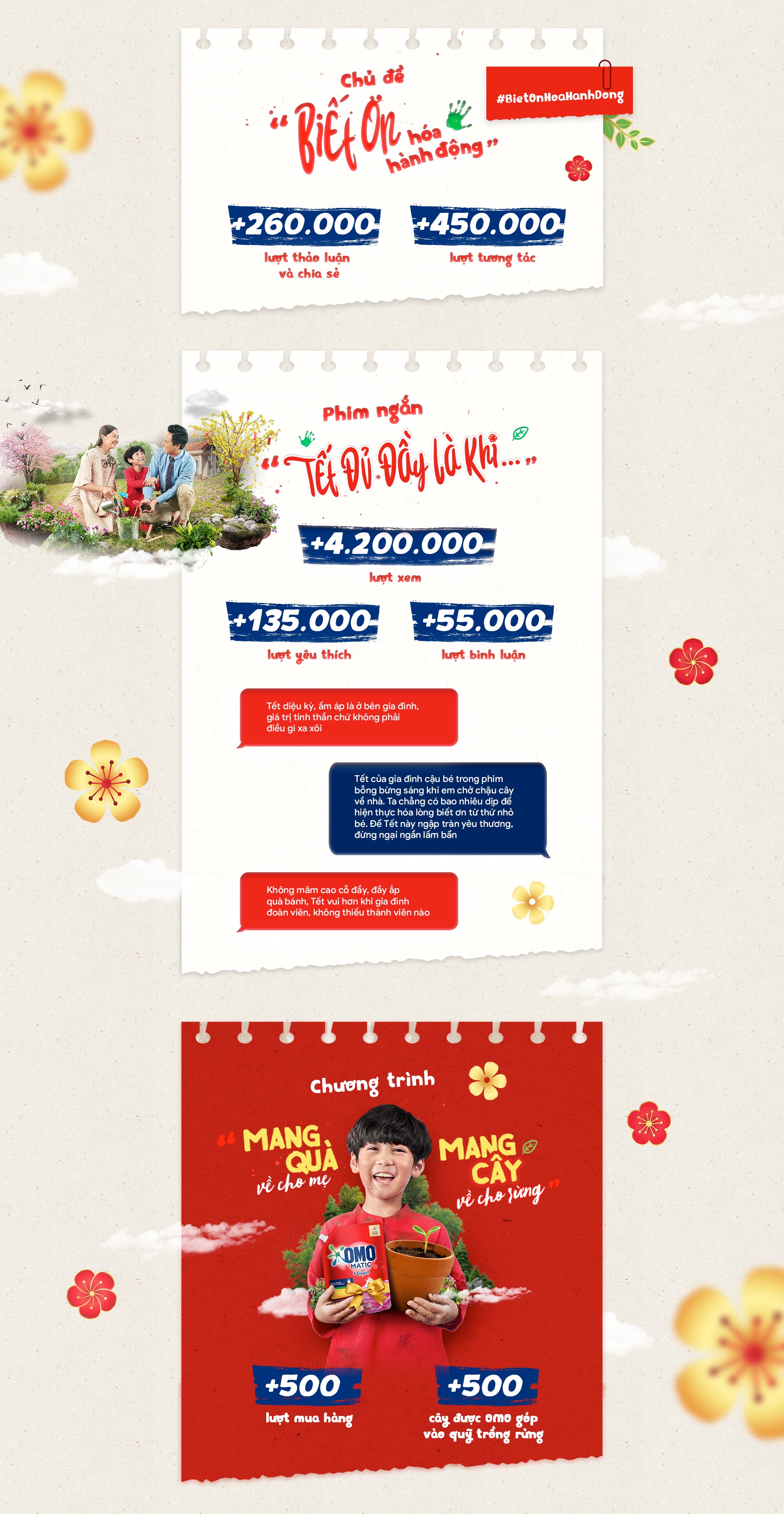 Mong muốn tiếp tục lan tỏa niềm biết ơn trong ngày Tết, OMO triển khai chương trình “Biết ơn hóa hành động - Lấm bẩn hóa Tết vui” với việc chia sẻ những “chậu cây biết ơn”. Tại đây, người tham gia có thể chia sẻ câu chuyện biết ơn của bản thân, gửi những “chậu cây biết ơn” chứa thông điệp biết ơn đến chính mình, bạn bè hay gia đình. Sau 3 ngày đầu tiên, chương trình nhận được sự hưởng ứng của hàng nghìn nghệ sĩ Việt và các bạn trẻ.