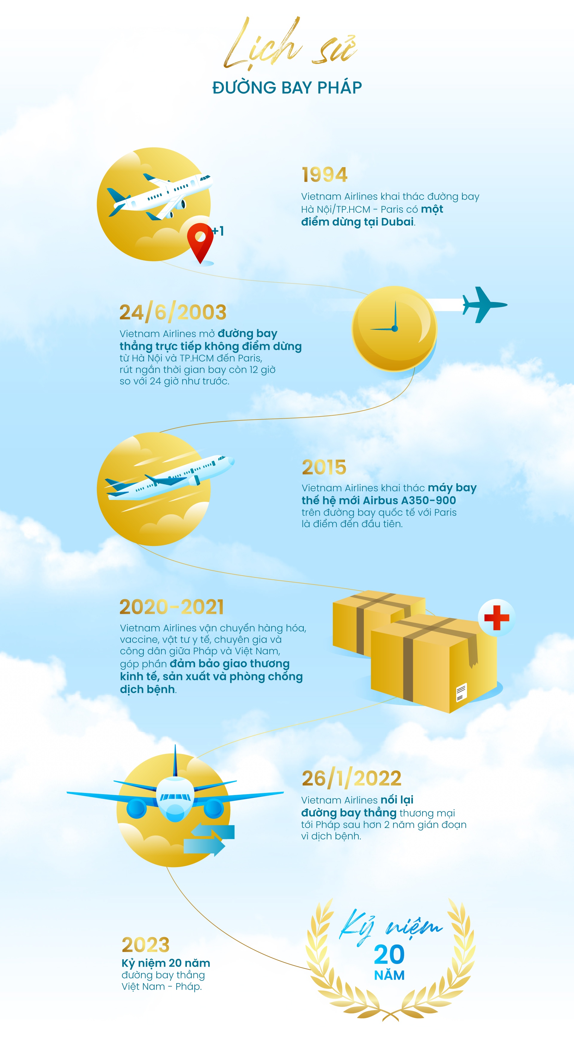 Sau 20 năm đưa vào khai thác chính thức đường bay Pháp, Vietnam Airlines đã chuyên chở gần 3,8 triệu du khách tới với xứ sở hình lục lăng.