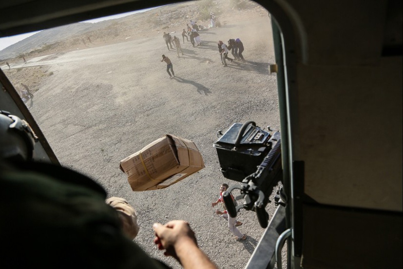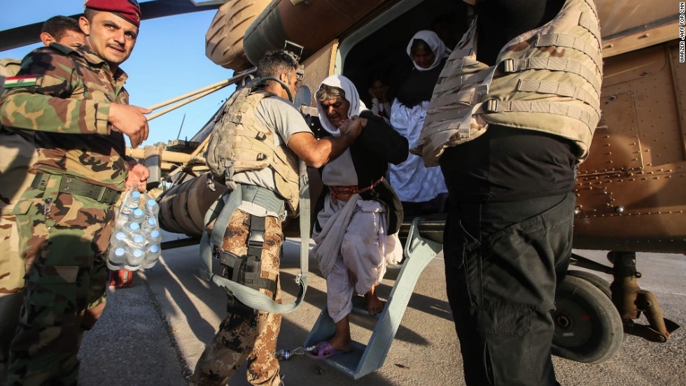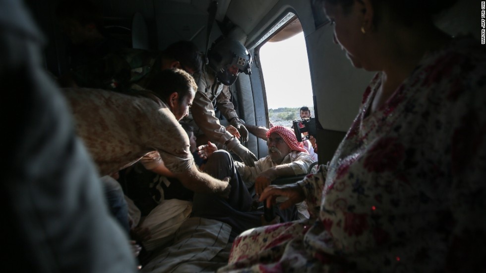 Lực lượng vũ trang trên trực thăng ném những thùng chứa đồ ăn, nước, sữa và các nhu yếu phẩm khác xuống dưới. Hàng ngàn người Yazidi phải chạy trốn vì sợ ISIS giết sau khi chúng thảm sát khoảng 500 người. |