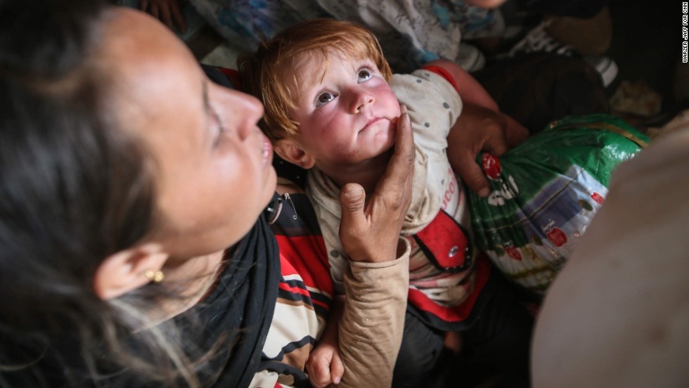Em bé ngồi trong lòng mẹ sau khi thoát khỏi khu vực nguy hiểm. Những đứa trẻ chưa thể ý thức tình cảnh nguy hiểm mà gia đình và tộc người của chúng đã và đang trải qua. |