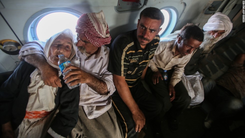 Những người Yazidi gặp nạn ngồi chen chúc trong máy bay. Thành viên phi hành đoàn tạo điều kiện để đưa càng nhiều người gặp nạn lên máy bay càng tốt. |