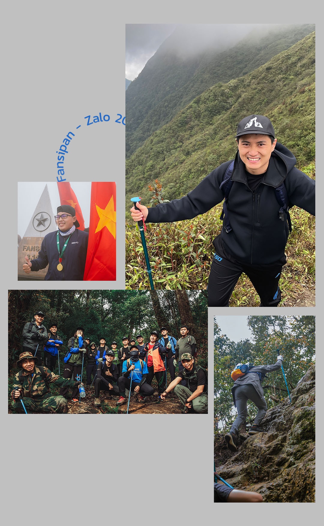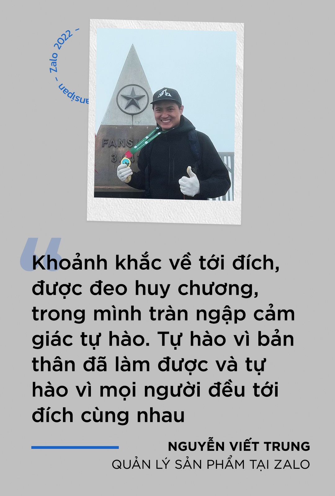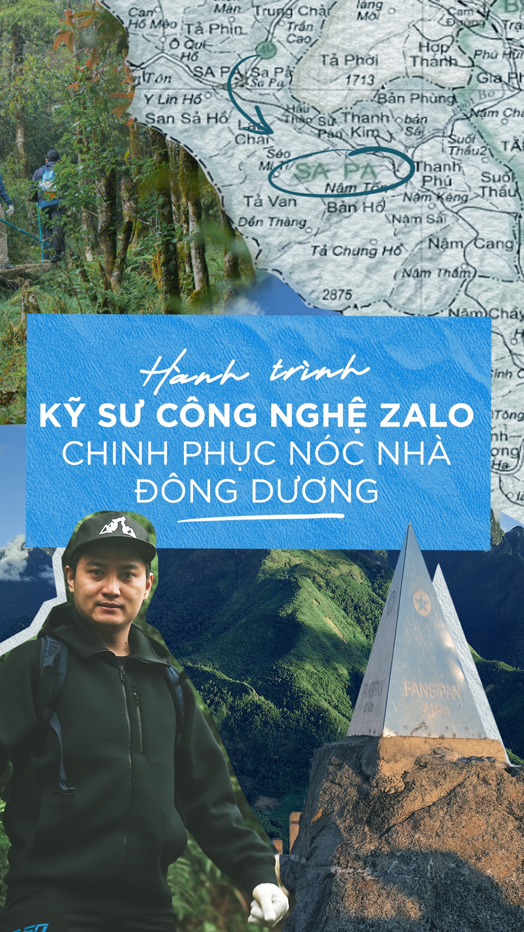 Gần 10 tiếng trekking, Viết Trung cùng các kỹ sư công nghệ Zalo trải qua nhiều dạng địa hình, từ đường mòn bằng đến dốc đá, dốc bậc thang... trong điều kiện thời tiết lạnh và nhiều sương mù để đến được đỉnh Fansipan. Giây phút đứng trên đỉnh núi cao chỉ ngắn ngủi nhưng đã phản ánh quá trình dài luyện tập thể lực, chuẩn bị tinh thần đón nhận thử thách của anh Trung nói riêng và những kỹ sư công nghệ Zalo nói chung.