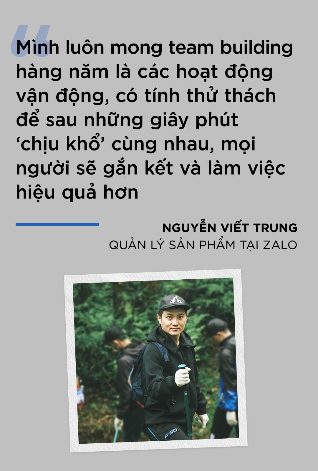 Văn hóa hỗ trợ đồng đội không chỉ có trong chuyến trekking ngắn ngủi. Hơn ai hết, gần 10 năm làm việc tại Zalo, anh Trung luôn cảm nhận được tinh thần đồng đội cùng nhau nỗ lực để tạo nên sản phẩm thân thiện với người dùng.