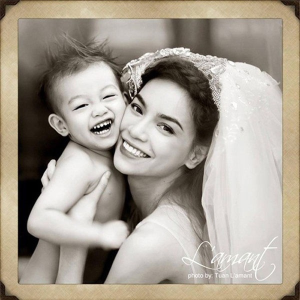 | Hồ Ngọc Hà diện đồ cưới chụp ảnh cùng con trai. |