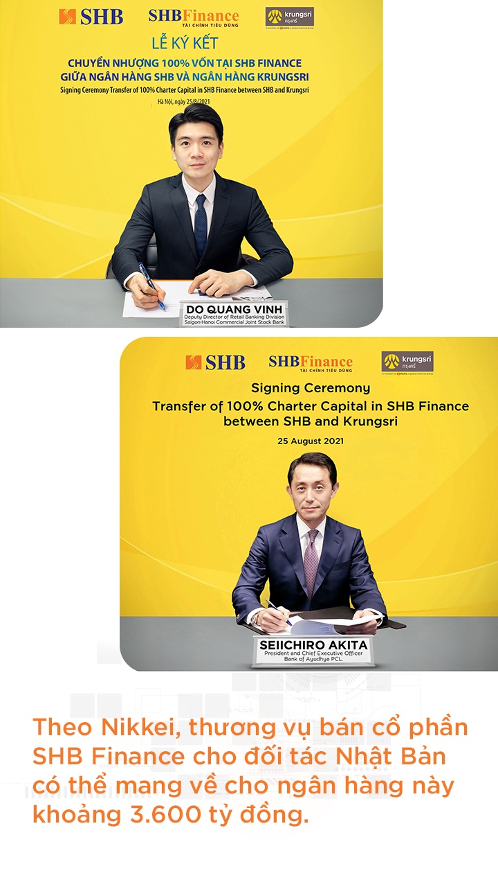 Ngay sau đại hội đồng cổ đông (ĐHĐCĐ) năm nay, loạt kế hoạch được SHB hiện thực hóa như khẳng định cam kết tăng lợi ích cho cổ đông, khách hàng và đối tác. Cụ thể tháng 8 vừa qua, ngân hàng ký thỏa thuận thoái vốn tại SHB Finance cho Krungsri của Thái Lan (thành viên chiến lược thuộc Tập đoàn MUFG - Nhật Bản). Thương vụ dự kiến mang về khoảng 3.600 tỷ đồng, theo hãng tin quốc tế Nikkei.