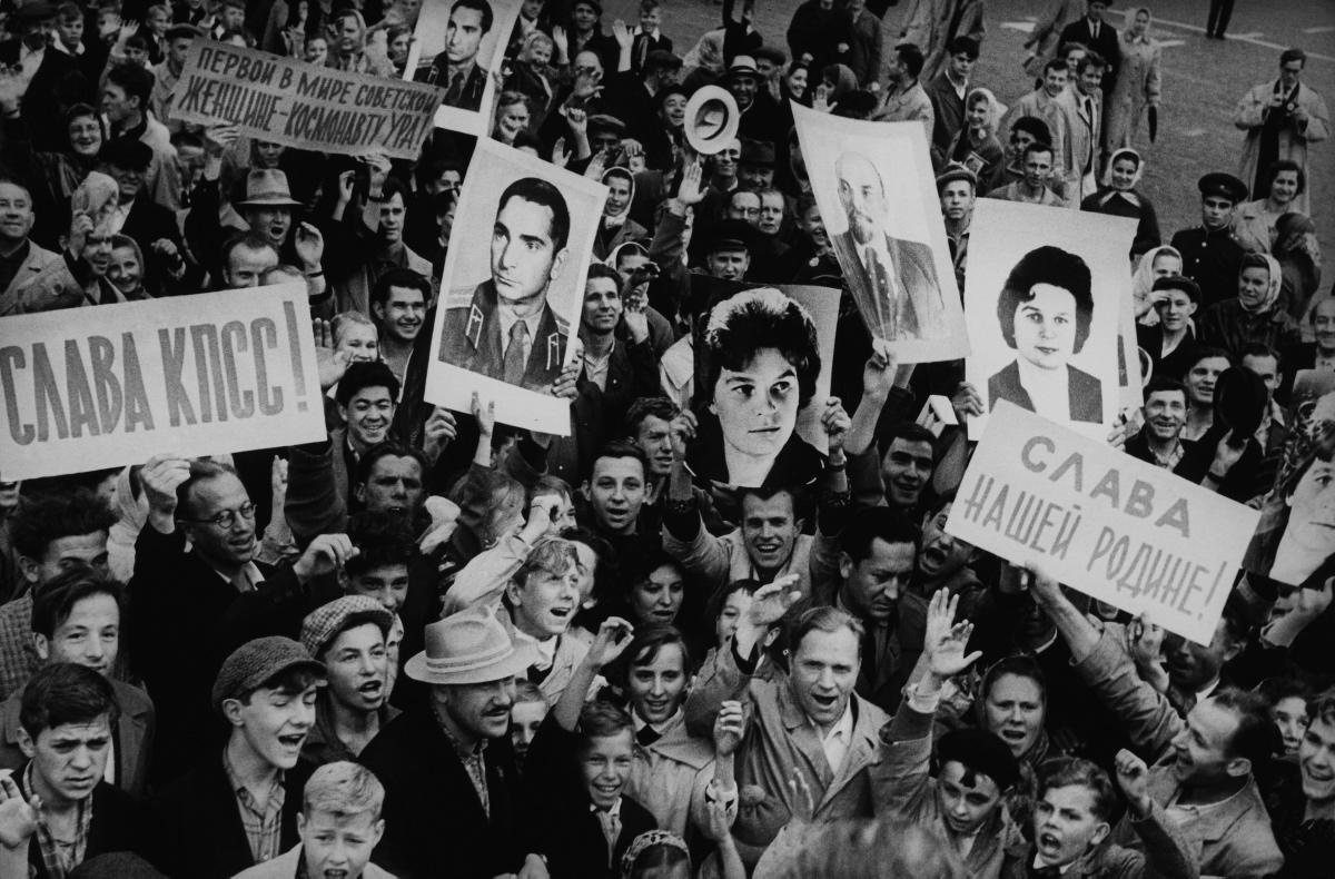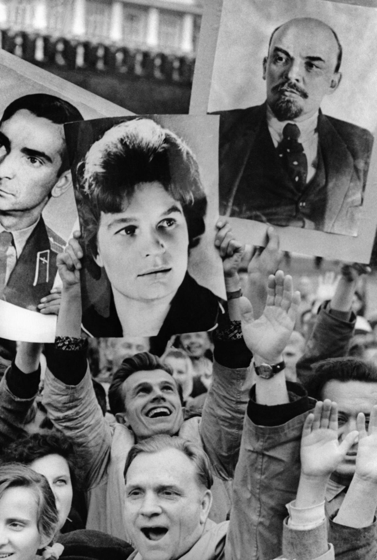 | Người dân Liên Xô cầm hình phi hành gia Valery Bykovsky và cô Tereshkova ở đường phố tại Moscow. Theo kế hoạch, ông Bykovsky sẽ điều khiển tàu Vostok 5 bay vào vũ trụ ngày 14/6/1964. Hai ngày sau, Tereshkova cùng phi thuyền Vostok 6 tiếp nối hành trình. Khi đó, cô 26 tuổi. |