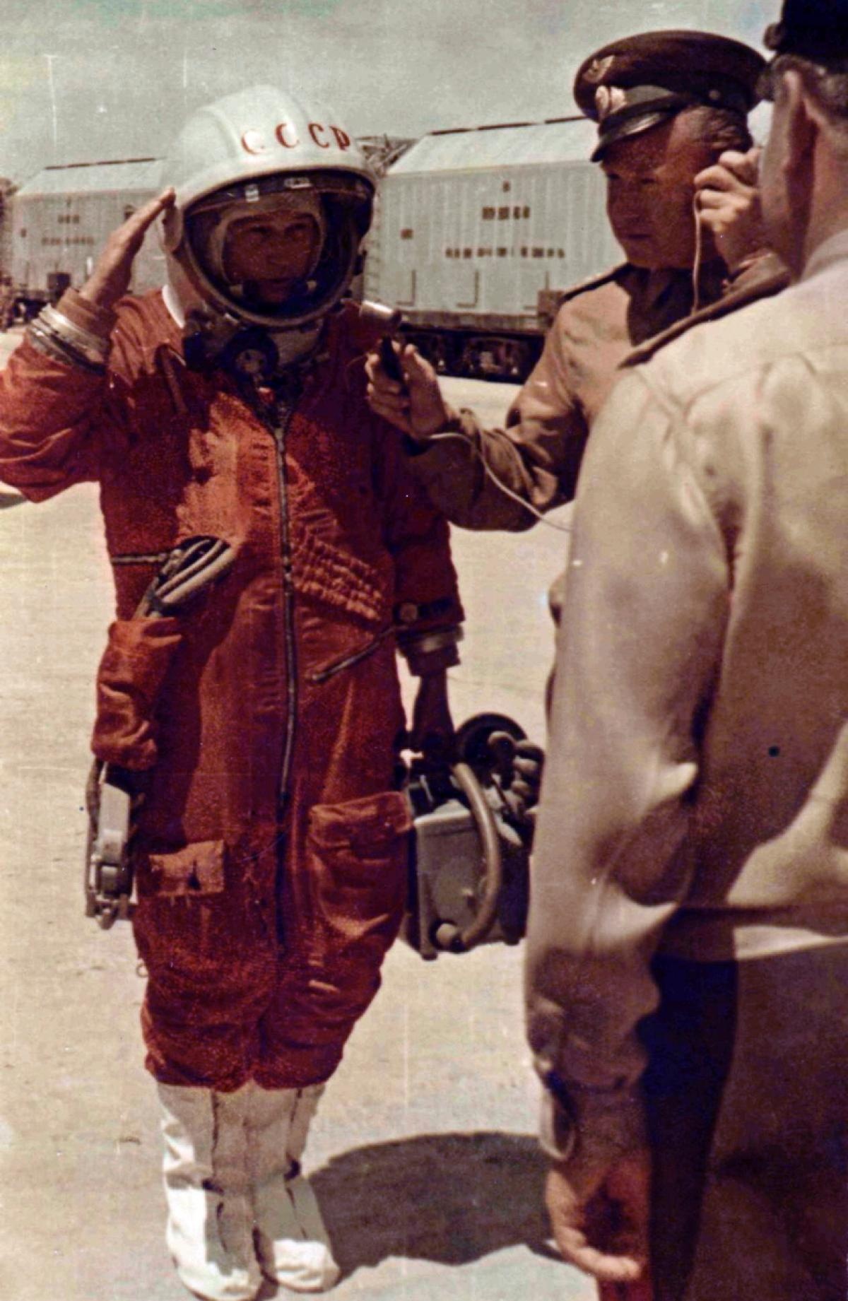 | Tereshkova chào cấp trên trước khi bước vào tàu Vostok 6 để bắt đầu hành trình chinh phục vũ trụ. |